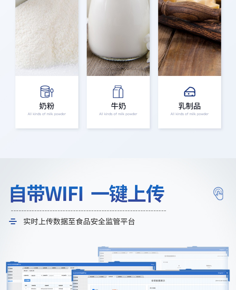 6、儀器帶有監(jiān)管平臺(tái)。檢測結(jié)果可直接無線上傳。進(jìn)行數(shù)據(jù)分析處理,檢測乳制品等長短期動(dòng)態(tài),達(dá)到問題預(yù)估、預(yù)警。