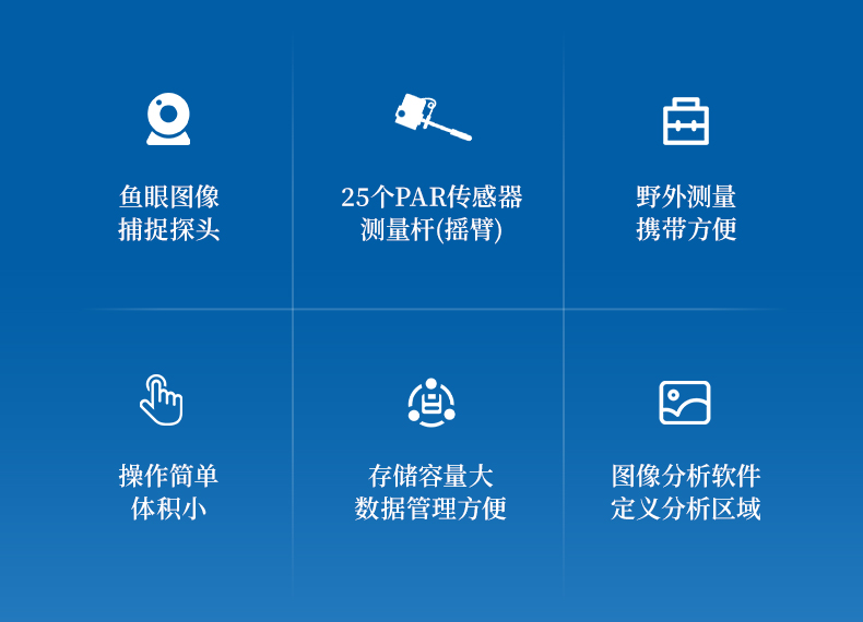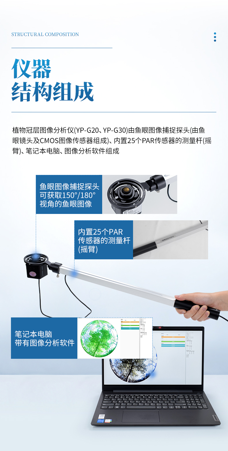 植物冠層圖像分析儀由魚眼圖像捕捉探頭(由魚眼鏡頭及CMOS圖像傳感器組成)、內(nèi)置25個PAR傳感器的測量桿(搖臂)、筆記本電腦、圖像分析軟件組成。魚眼探頭安裝在一個很輕的搖臂的頂端,它可以獲取180°視角的魚眼圖像。圖像的顯示和存貯由配置的筆記本計算機完成。