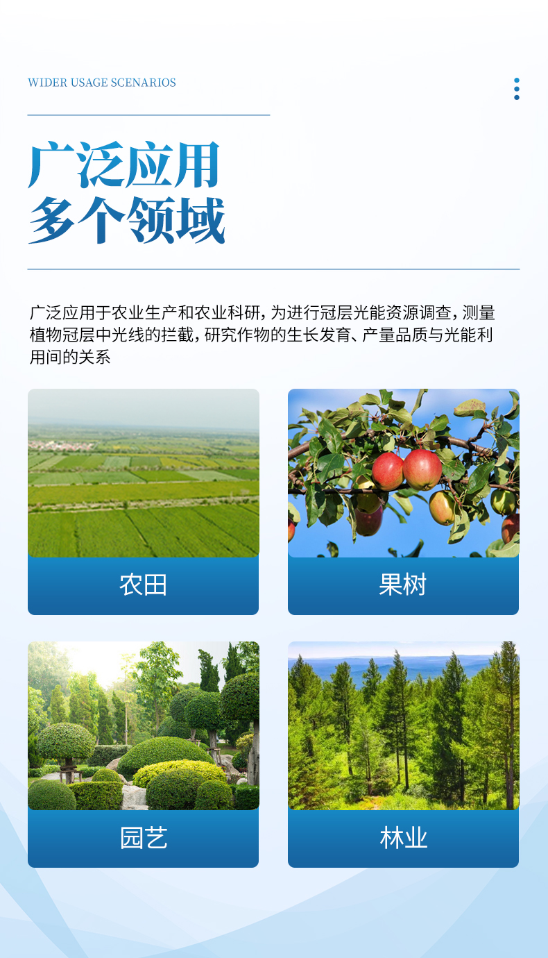 植物冠層圖像分析儀根據(jù)各種圖像處理手段提取多個角度的冠層間隙率,采用裝配魚眼鏡頭的相機從樹冠下向上拍攝冠層照片,利用間隙率參數(shù)來反演出各種冠層參數(shù),導(dǎo)田園合理施肥、現(xiàn)代化農(nóng)場高效管理提供可靠的科學(xué)依據(jù),廣泛應(yīng)用于農(nóng)業(yè)、林業(yè)、植物等科學(xué)研究和生產(chǎn)指導(dǎo)。