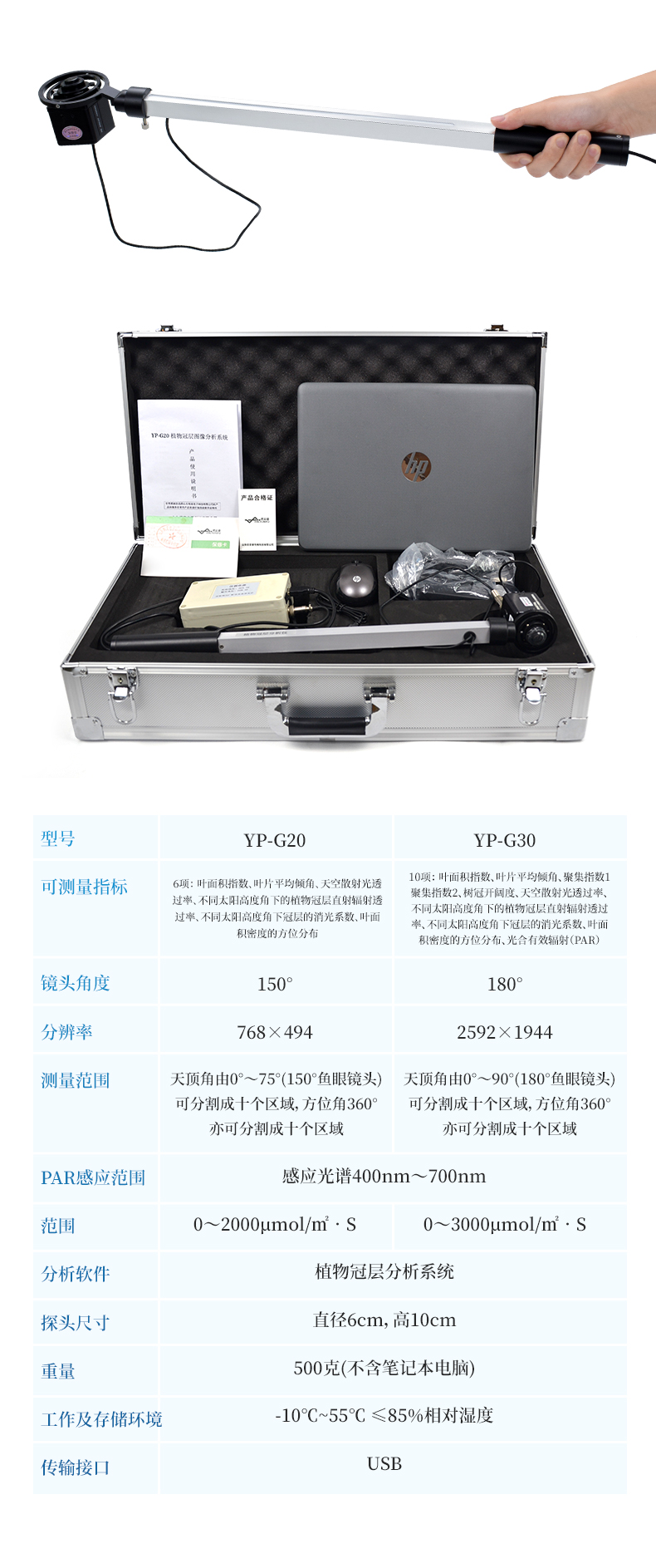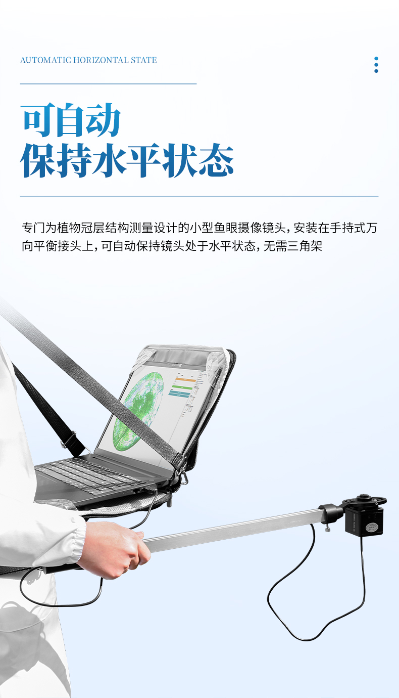1. 魚眼鏡頭可自動保持水平狀態(tài):專門為植物冠層結(jié)構(gòu)測量設(shè)計的小型魚眼攝像鏡頭安裝在手持式萬向平衡接頭上,可自動保持鏡頭處于水平狀態(tài),無需三角架;