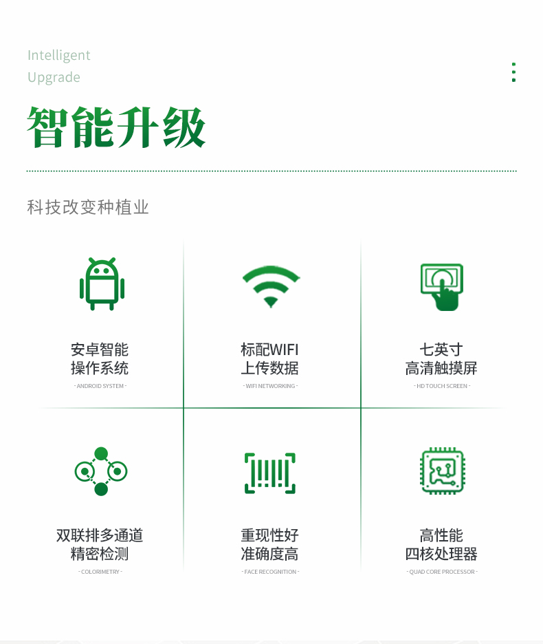 【產(chǎn)品簡(jiǎn)介】安卓智能操作系統(tǒng),可以檢測(cè)植株氮磷鉀、有機(jī)質(zhì)、微量元素及重金屬含量,快速檢測(cè)12個(gè)樣品