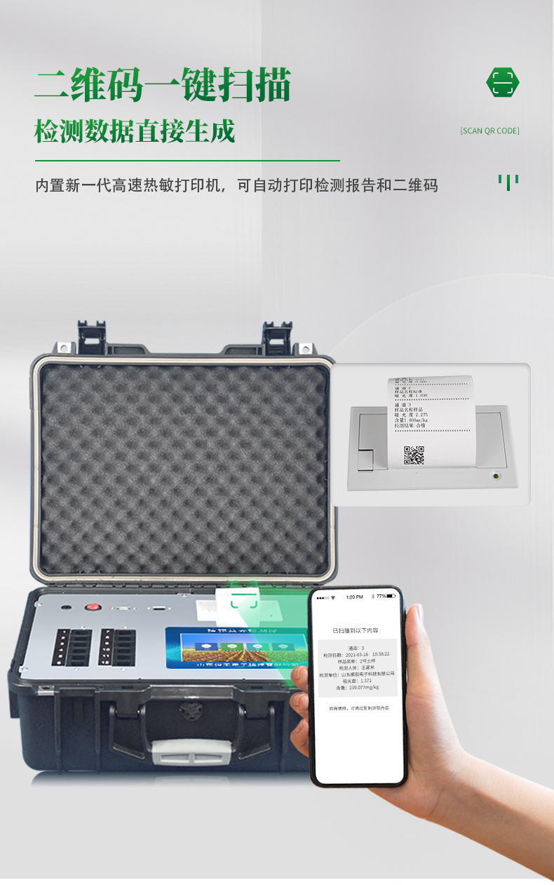 8、儀器內(nèi)置新一代高速熱敏打印機(jī),檢測(cè)完成可自動(dòng)打印檢測(cè)報(bào)告和二維碼。