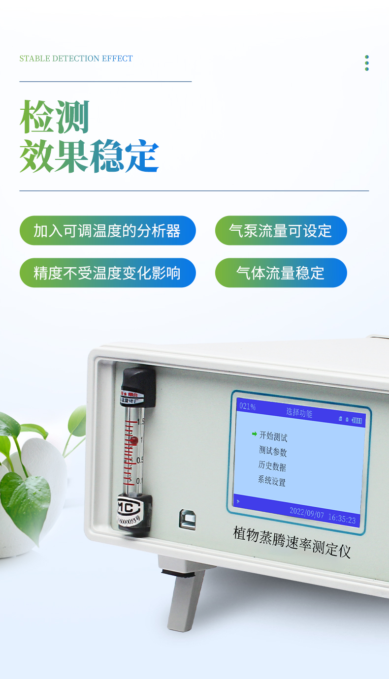 植物蒸騰速率是指水分通過植物體內(nèi)時,經(jīng)過植物體表(主要是葉片)以氣體的方式散發(fā)到大氣中的速度。植物的蒸騰作用能產(chǎn)生的蒸騰拉力,蒸騰拉力是植物被動吸水與轉(zhuǎn)運(yùn)水分的主要動力,這對高大的喬木尤為重要;蒸騰作用可以促進(jìn)木質(zhì)部汁液中物質(zhì)的運(yùn)輸,土壤中的礦質(zhì)鹽類和根系合成的物質(zhì)可隨著水分的吸收和集流而被運(yùn)輸和分布到植物體各部分去;蒸騰作用還可以降低植物體的溫度,防止葉片被灼傷,這是因為水的氣化熱高,在蒸騰過程中可以散失掉大量的輻射熱。蒸騰作用的正常進(jìn)行有利于CO2的同化,這是因為葉片進(jìn)行蒸騰作用時,氣孔是開放的,開放的氣孔便成為CO2進(jìn)入葉片的通道。因此作物植物蒸騰速率測量儀對于農(nóng)業(yè)科研、教學(xué)、園藝研究、林業(yè)研究等具有重大意義。