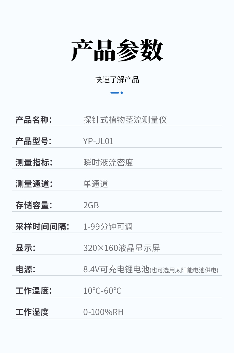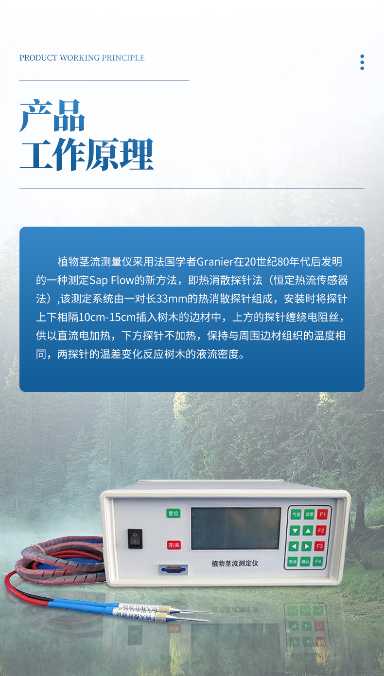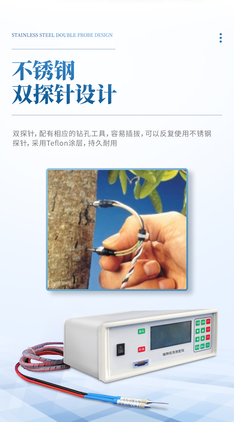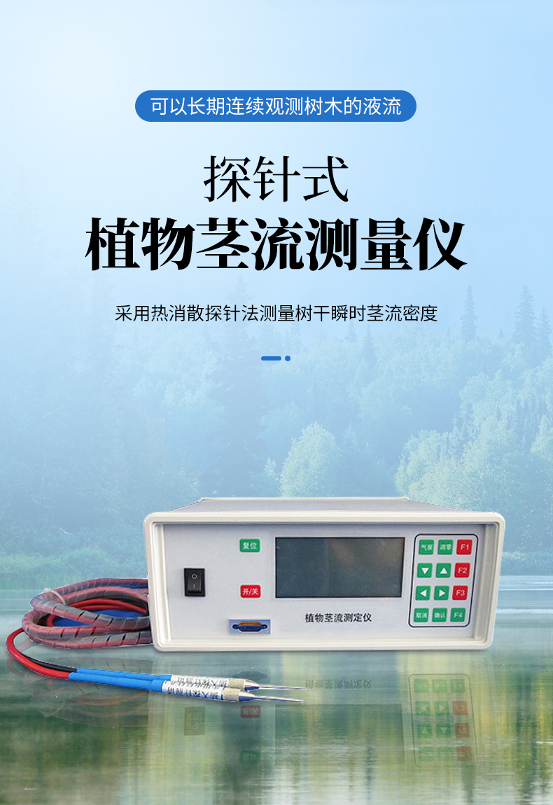 植物莖流測量儀采用法國學(xué)者Granier在20世紀80年代后發(fā)明的一種測定Sap Flow的新方法,即熱消散探針法(恒定熱流傳感器法)。該方法的數(shù)據(jù)采集具有準確穩(wěn)定的特點,而且可以連續(xù)不間斷的讀取數(shù)據(jù),因而數(shù)據(jù)具有系統(tǒng)性。該測 定系統(tǒng)由一對長33mm的熱消散探針組成,安裝時將探針上下相隔10cm-15cm插入樹木的邊材中,上方的探針纏繞電阻絲,供以直流電加熱,下方探針不 加熱,保持與周圍邊材組織的溫度相同,兩探針的溫差變化反應(yīng)樹木的液流密度。