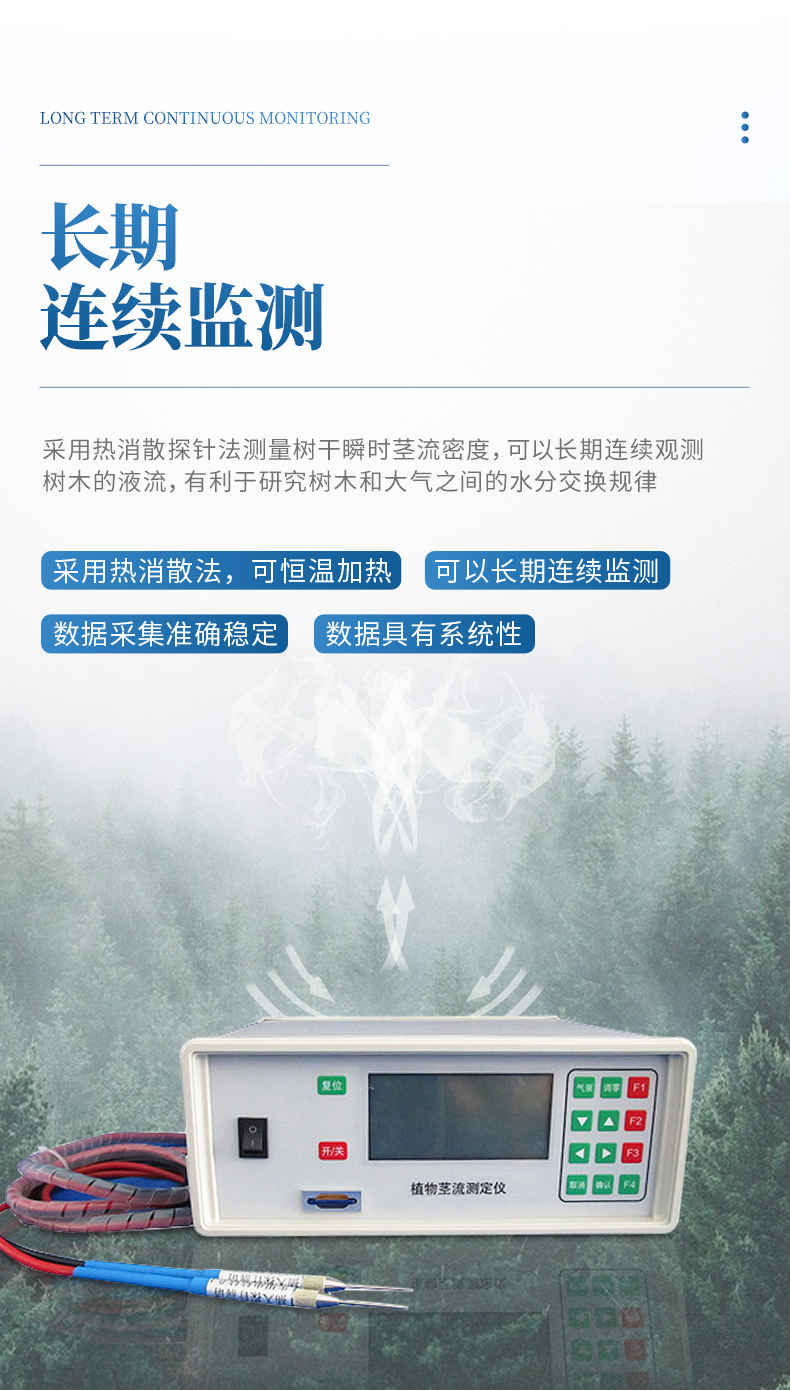 植物莖流測量儀采用熱消散探針法測量樹干瞬時莖流密度,可以長期連續(xù)觀測樹木的液流,有利于研究樹木和大氣之間的水分交換規(guī)律,并以此為觀測手段,長期監(jiān)測森林生態(tài)系統(tǒng)對環(huán)境變化的影響。對于造林綠化、森林管理和林業(yè)管理等具有重要的理論指導(dǎo)意義和應(yīng)用價值。