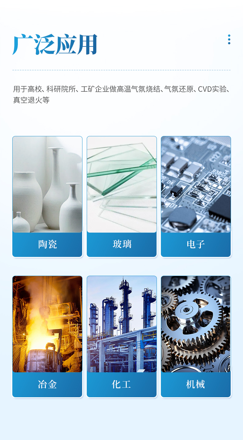 用于高校、科研院所、工礦企業(yè)做高溫氣氛燒結(jié)、氣氛還原、CVD實(shí)驗(yàn)、真空退火等。具有溫場(chǎng)均勻、升降溫速率快、節(jié)能、可通入多重氣體等特點(diǎn)。