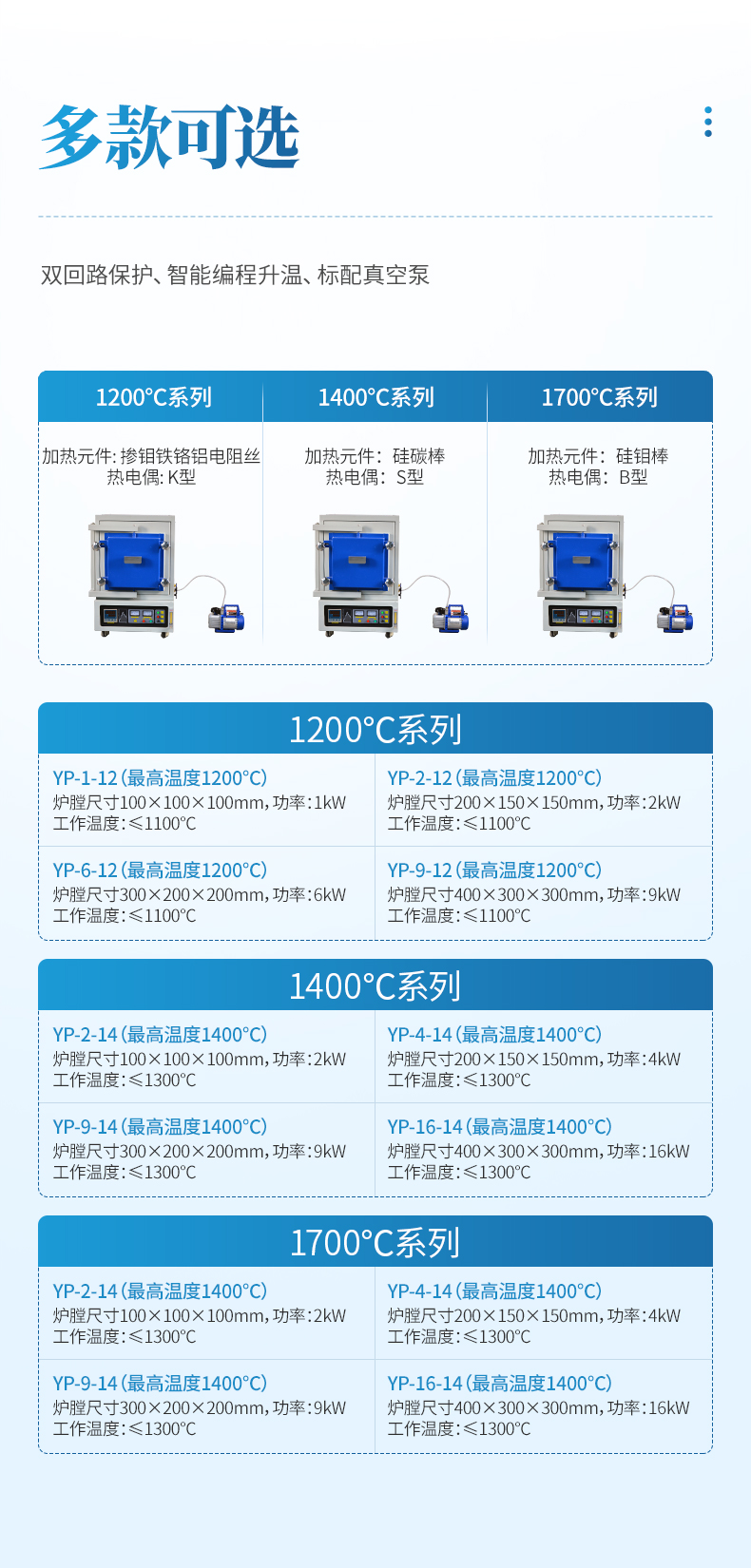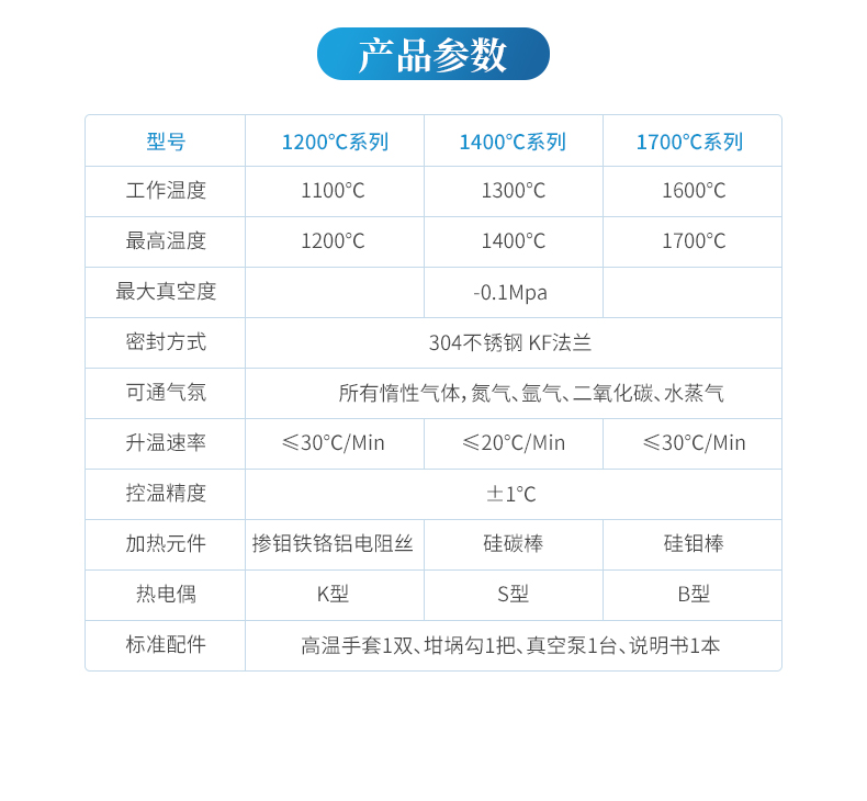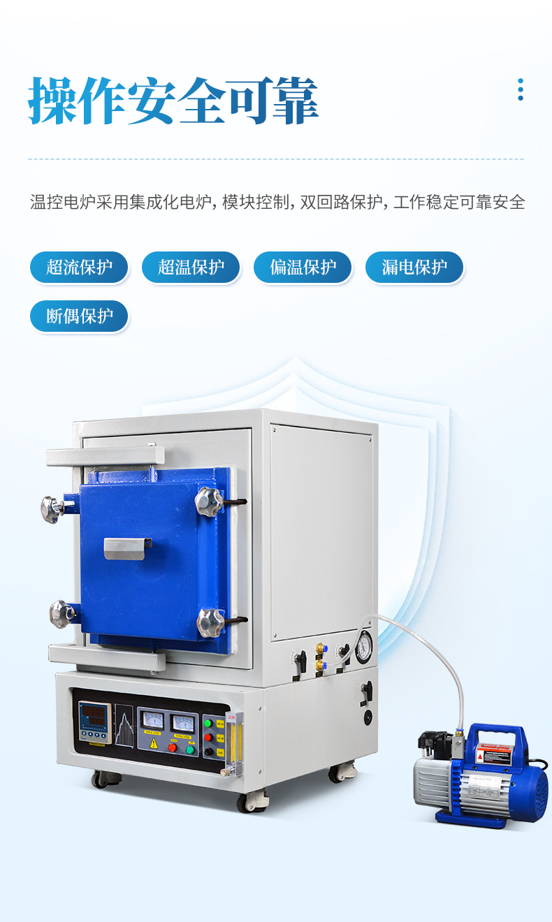 【產(chǎn)品簡(jiǎn)介】最高溫度:1200℃、爐膛:100*100*100mm、雙回路保護(hù)、智能編程升溫、標(biāo)配真空泵、1kW功率,工作溫度:1100℃