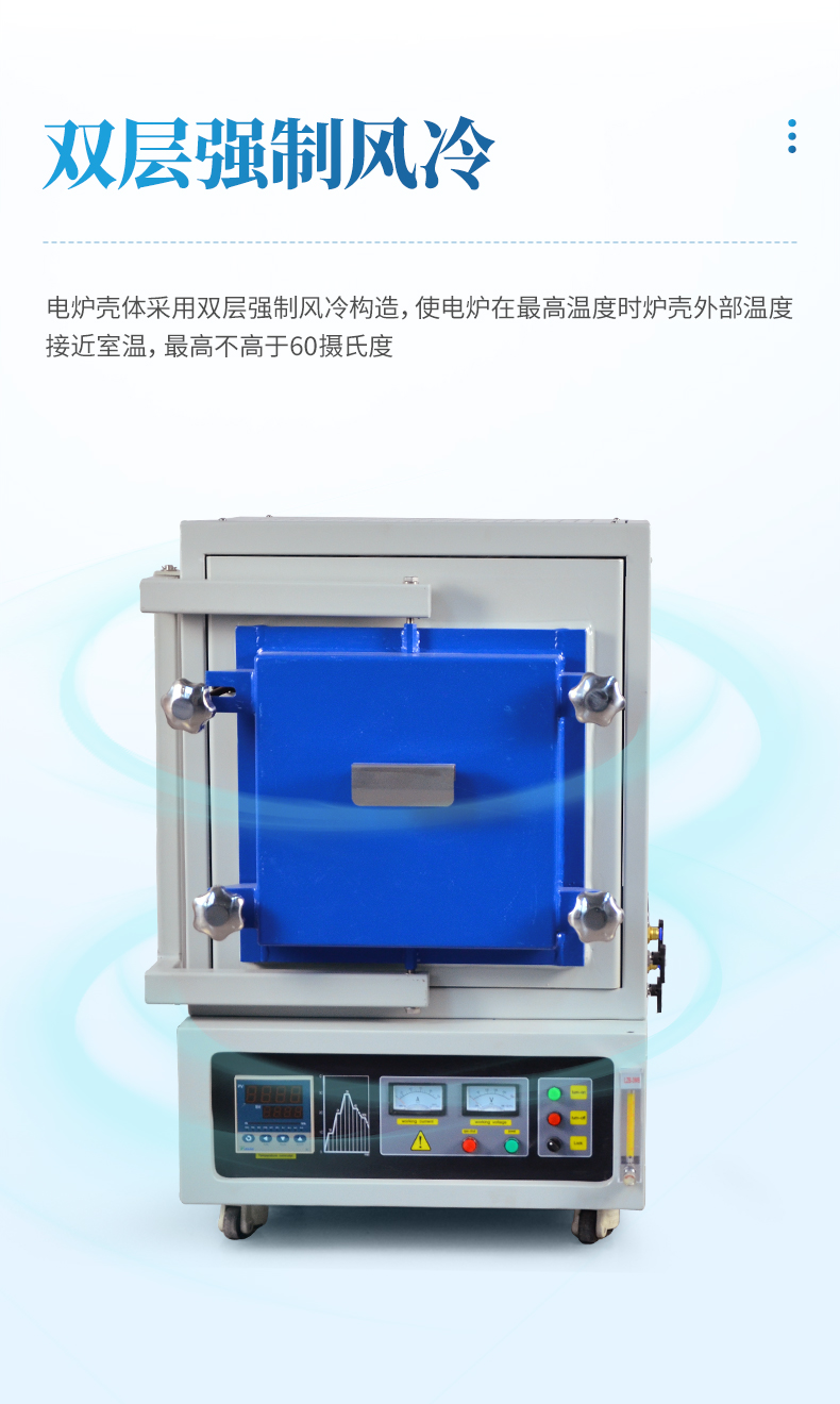 電爐殼體采用雙層強(qiáng)制風(fēng)冷構(gòu)造,使電爐在最高溫度時(shí)爐殼外部溫度接近室溫,最高不高于60攝氏度。