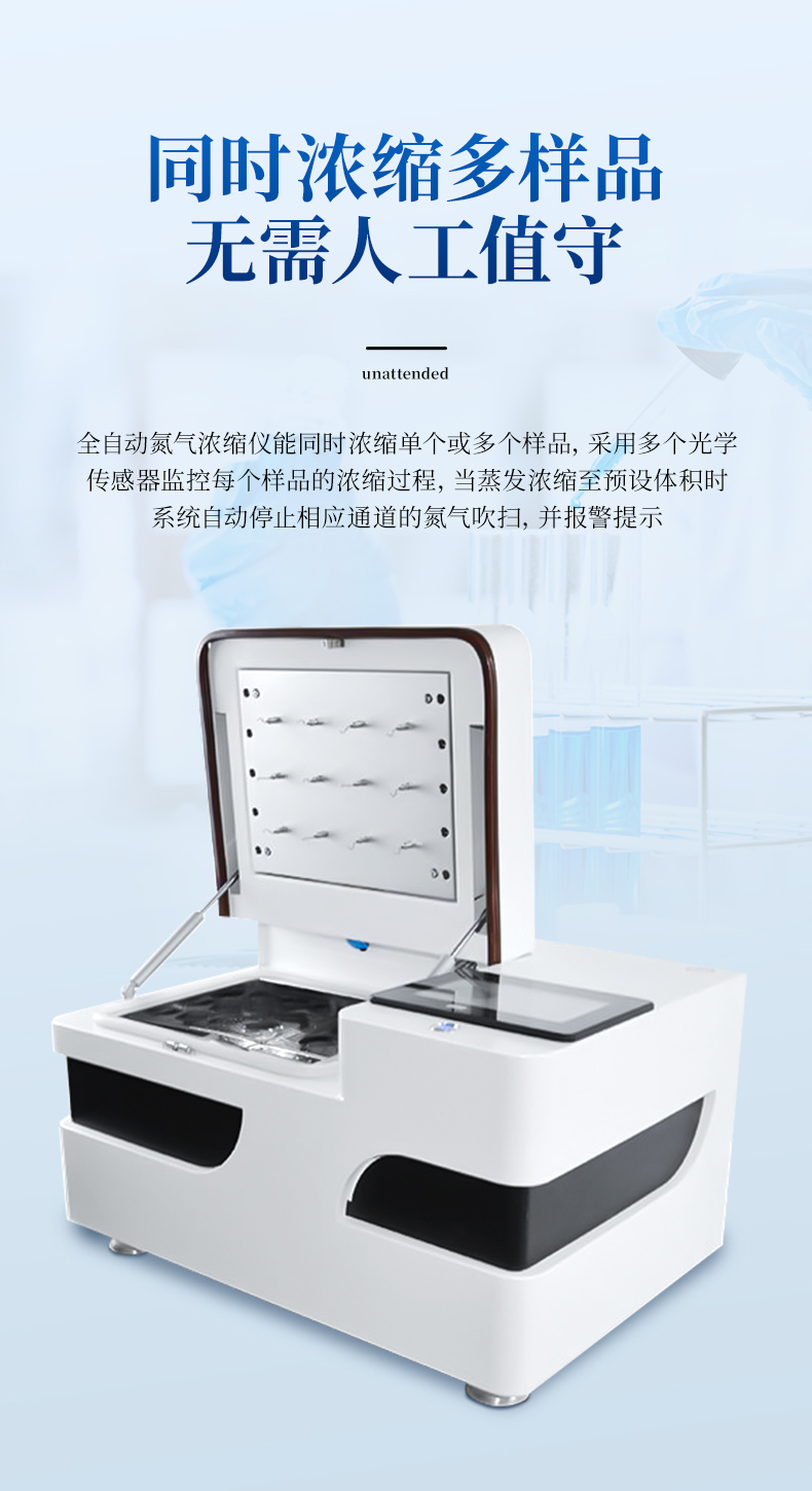 全自動(dòng)多功能干式氮吹儀YP-QD12G是我司結(jié)合實(shí)驗(yàn)室使用需求,從使用者方便安全快捷穩(wěn)定等多角度共同開(kāi)發(fā)的新型濃縮定容產(chǎn)品,產(chǎn)品擺脫了常規(guī)市場(chǎng)上利用水浴加熱揮發(fā)而導(dǎo)致樣品進(jìn)行污染的弊端,確定樣品的安全性與準(zhǔn)確性,具有無(wú)人值守、準(zhǔn)確定容、大批量濃縮的特點(diǎn),可多組數(shù)據(jù)儲(chǔ)存功能,實(shí)現(xiàn)了全自動(dòng)化的定量及批量濃縮,濃縮全程,讓繁瑣的濃縮過(guò)程變得靈活、省心、高效和安全。