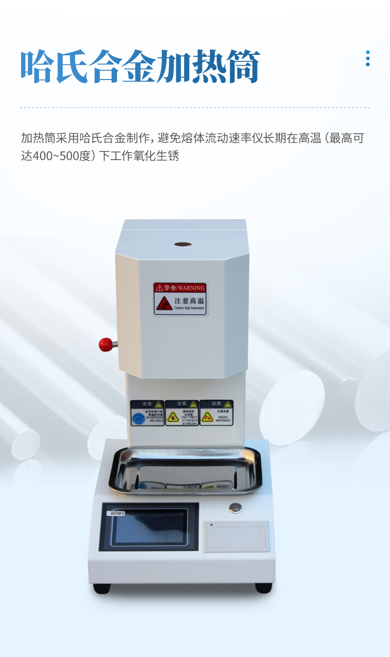 1、加熱筒采用哈氏合金制作,避免熔體流動速率儀長期在高溫(最高可達400~500度)下工作氧化生銹。