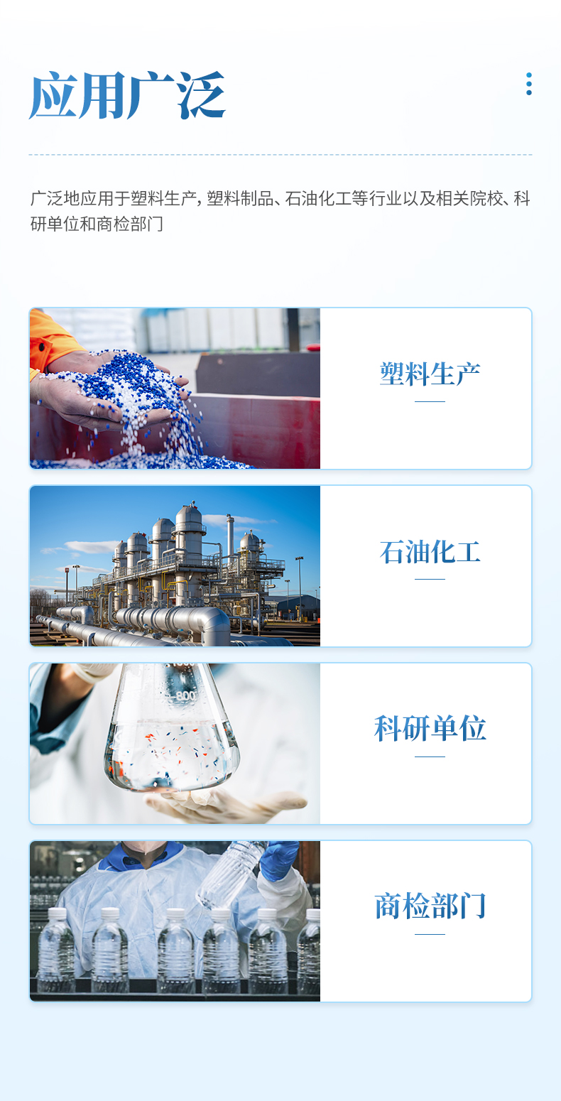 用于測定各種塑膠、樹脂在粘流狀態(tài)時熔體流動速率MFR值,它既適用于熔融溫度較高的聚碳酸酯、聚芳砜、氟塑料、尼龍等工程塑料,也適用于聚乙烯(PE)、聚苯乙烯(PS)、聚丙烯(PP)、ABS樹脂、聚甲醛(POM)、聚碳酸酯(PC)樹脂等熔融溫度較低的塑料測試,廣泛地應(yīng)用于塑料生產(chǎn),塑料制品、石油化工等行業(yè)以及相關(guān)院校、科研單位和商檢部門。