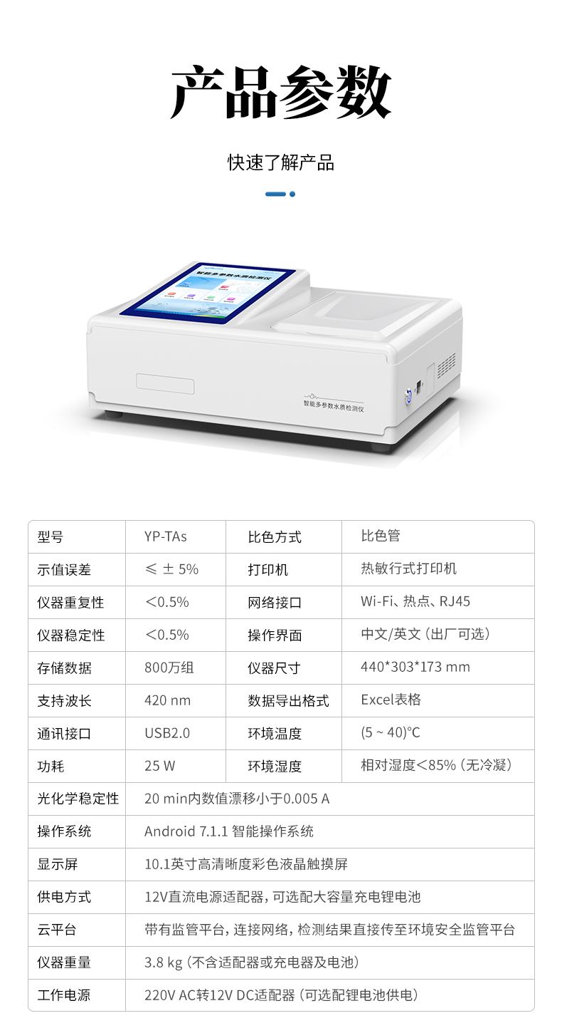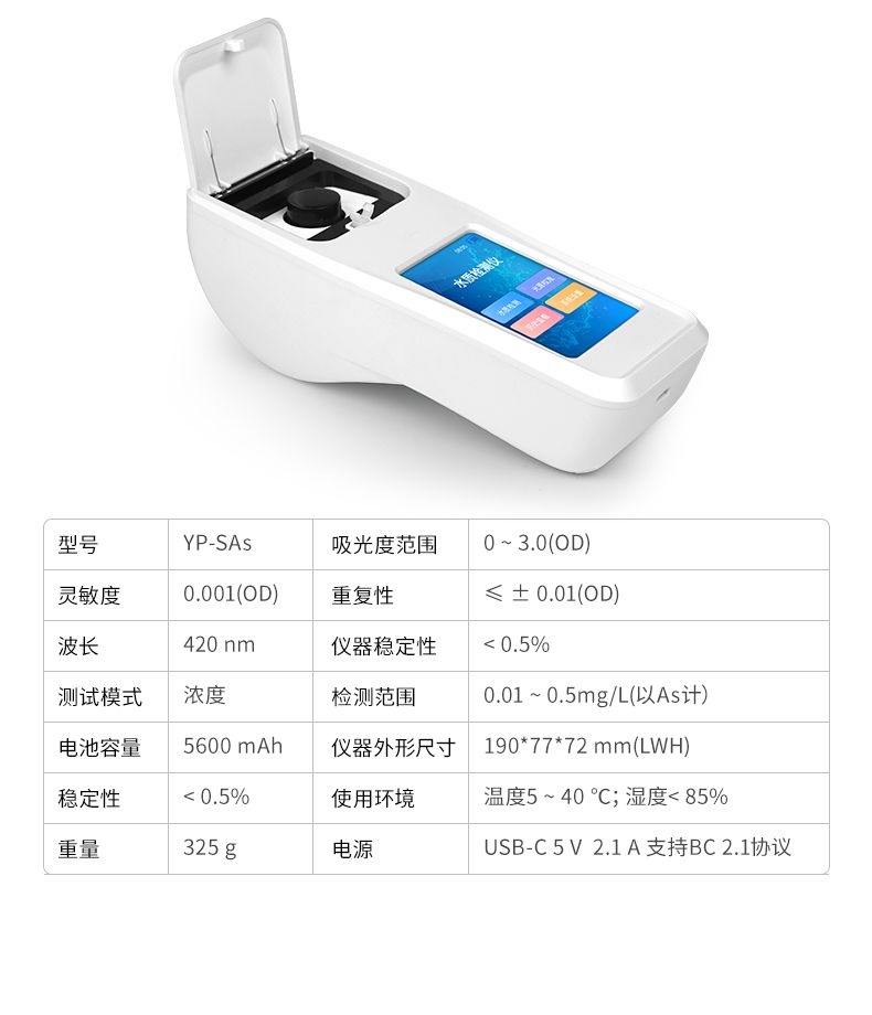 水中砷檢測(cè)儀是一款基于分光光度法原理研發(fā)的智能化水中總砷檢測(cè)儀,專門用于飲用水、地表水、地下水及廢水中總砷的快速定量分析。儀器采用高性能LED光源與大面積光電池,結(jié)合優(yōu)化的硝酸銀-聚乙烯醇吸收顯色體系,確保了在420nm波長(zhǎng)下檢測(cè)的高靈敏度與穩(wěn)定性。其搭載的Android智能操作系統(tǒng)與,使操作直觀流暢;具備萬(wàn)條數(shù)據(jù)存儲(chǔ)、Wi-Fi/藍(lán)牙傳輸及防水機(jī)身,非常適合實(shí)驗(yàn)室與現(xiàn)場(chǎng)檢測(cè)場(chǎng)景。儀器支持多點(diǎn)標(biāo)定與內(nèi)置曲線,配合Type-C通用充電與長(zhǎng)續(xù)航設(shè)計(jì),為用戶提供了準(zhǔn)確、便捷、可靠的一體化砷檢測(cè)解決方案。