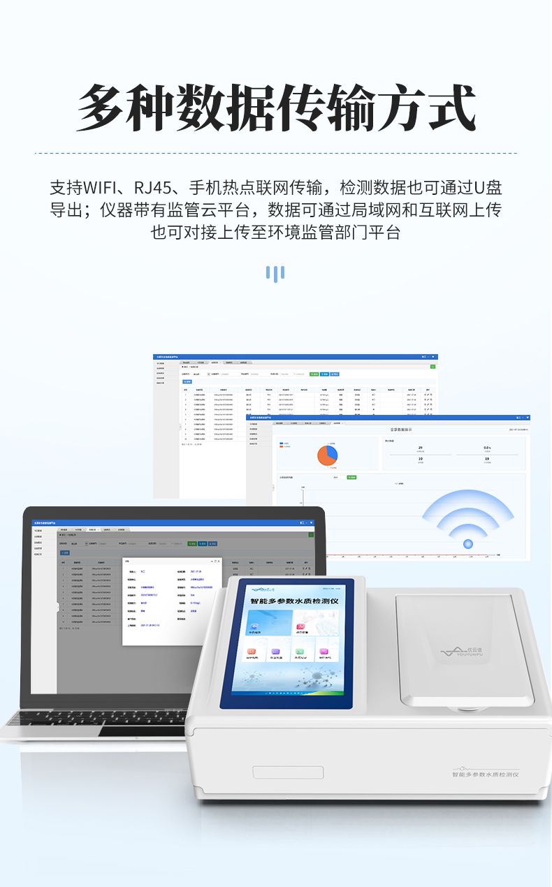 5.具有無(wú)線通訊功能,支持Wi-Fi、RJ45、手機(jī)熱點(diǎn)聯(lián)網(wǎng)傳輸,檢測(cè)數(shù)據(jù)亦可通過(guò)U盤導(dǎo)出;