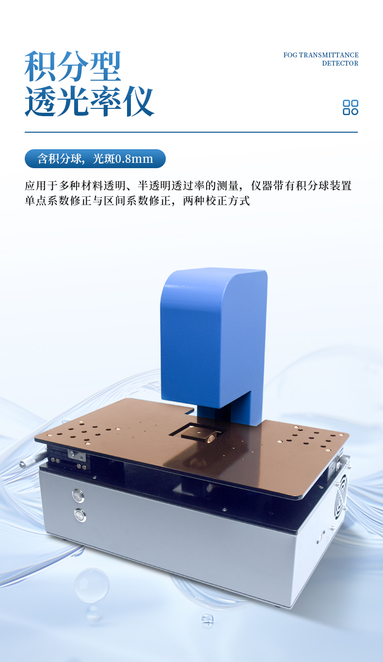 積分型透光率檢測(cè)儀應(yīng)用于:薄膜、手機(jī)屏、顯示屏、玻璃鏡片、磨砂材料、膠水、油墨、鍍膜鏡片(包含平面、球面、非球面)等透明、半透明透過(guò)率的測(cè)量,該儀器帶有帶積分球裝置。