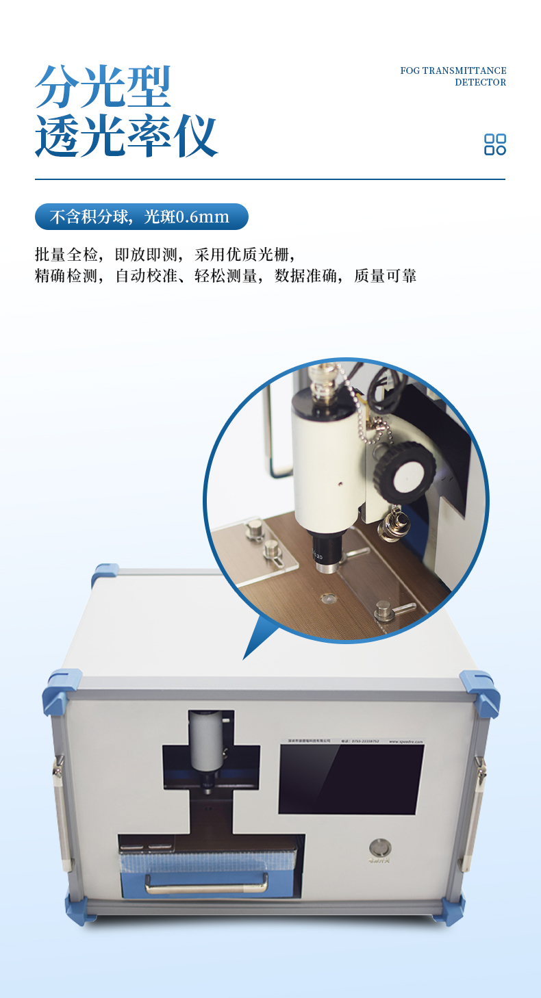 1.本儀器能快速測(cè)量各類(lèi)平面、非平面光學(xué)、樹(shù)脂、薄膜的透射率,適合批量樣片全檢,方便的測(cè)量治具,簡(jiǎn)單調(diào)整一次后,大批量就無(wú)需人工對(duì)孔,即放即測(cè),最高效率;
