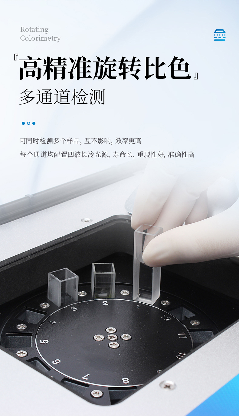 2、采用精密旋轉(zhuǎn)比色池設(shè)計(jì)(專(zhuān)利號(hào):ZL 2018 2 1777724.7),光源一致性更加精確,保證檢測(cè)精度。