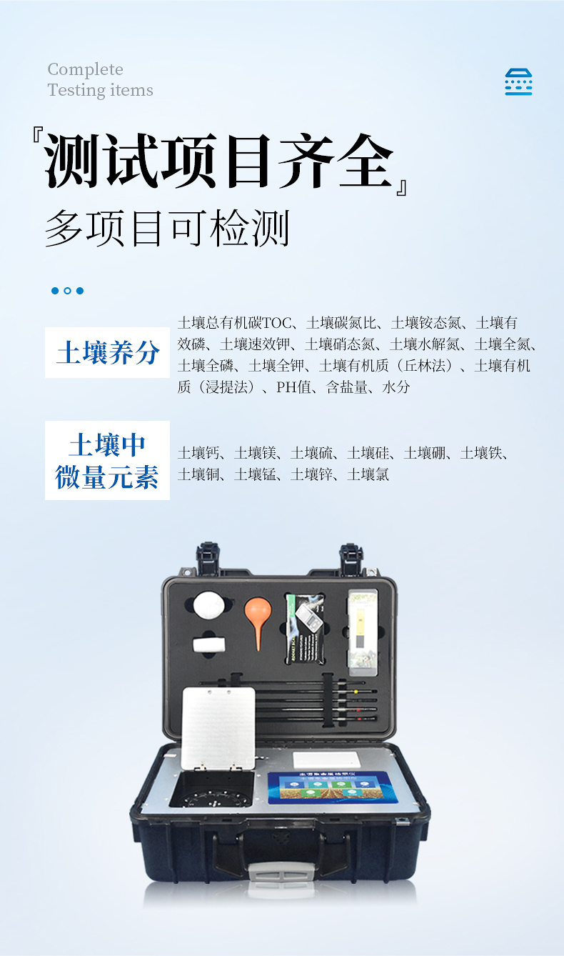 1、土壤養(yǎng)分:●土壤碳氮比、土壤銨態(tài)氮、土壤有效磷、土壤速效鉀、土壤硝態(tài)氮、土壤水解氮、土壤全氮、土壤全磷、土壤全鉀、土壤有機(jī)質(zhì)(丘林法)、土壤有機(jī)質(zhì)(浸提法)、PH值、含鹽量、水分?!裢寥乐形⒘吭兀和寥棱}、土壤鎂、土壤硫、土壤硅、土壤硼、土壤鐵、土壤銅、土壤錳、土壤鋅、土壤氯。