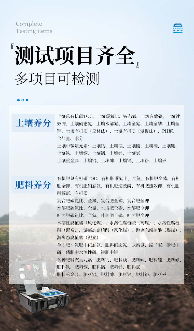 【產(chǎn)品簡介】壤氮磷鉀誤差≤1%,有機質(zhì)誤差≤2%,微量元素相對誤差≤5%;肥料單項誤差≤0.5%,氮磷鉀三項誤差≤1%;重金屬相對誤差小于等于5%
