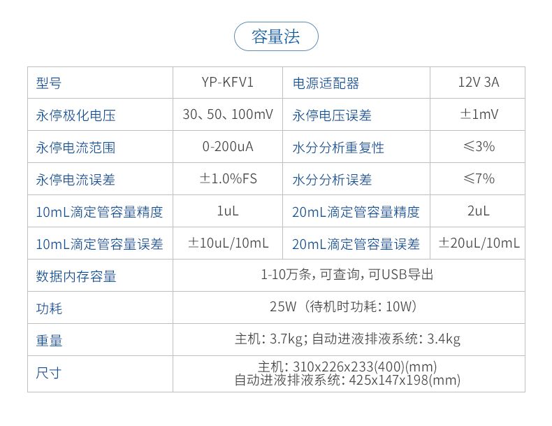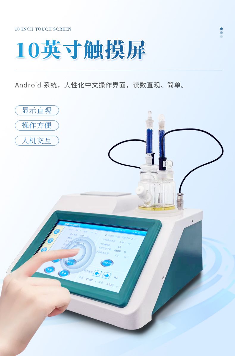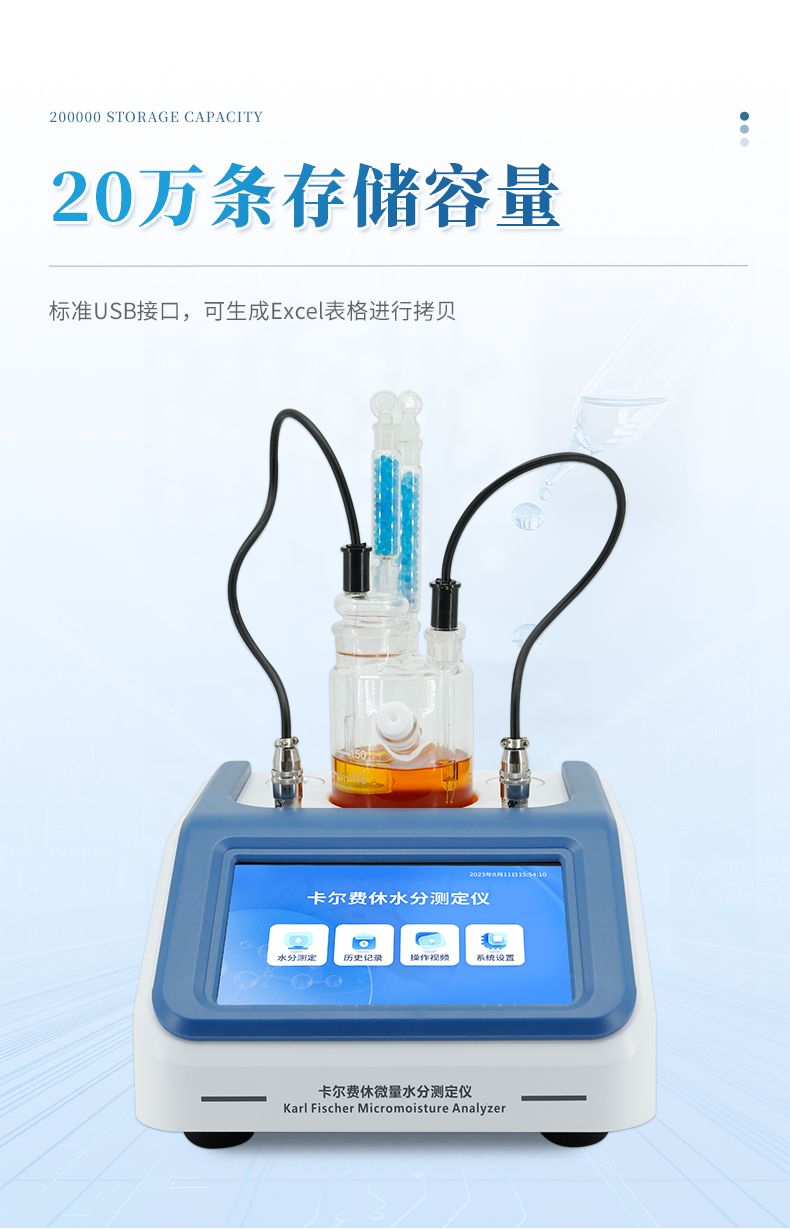 2.儀器具有試驗結(jié)果存儲、打印、計算功能;樣品測定過程由儀器自動控制,攪拌、測定60秒左右自動完成,直接顯示測定結(jié)果;全密封滴定池瓶,避免試劑與人接觸,也避免環(huán)境濕度的影響;并具有自動計算平均值和歷史記錄打印功能,能打印出百分含量、樣品編號、試驗員、實驗日期等內(nèi)容;儀器準(zhǔn)確度為:①水含量小于10微克水時,測量值誤差小于2ug水;②水含量在10微克-1000微克水時,測量誤差≤2ug水;③水含量在1000微克以上時,測量值誤差≤0.2%(不含進(jìn)樣誤差);