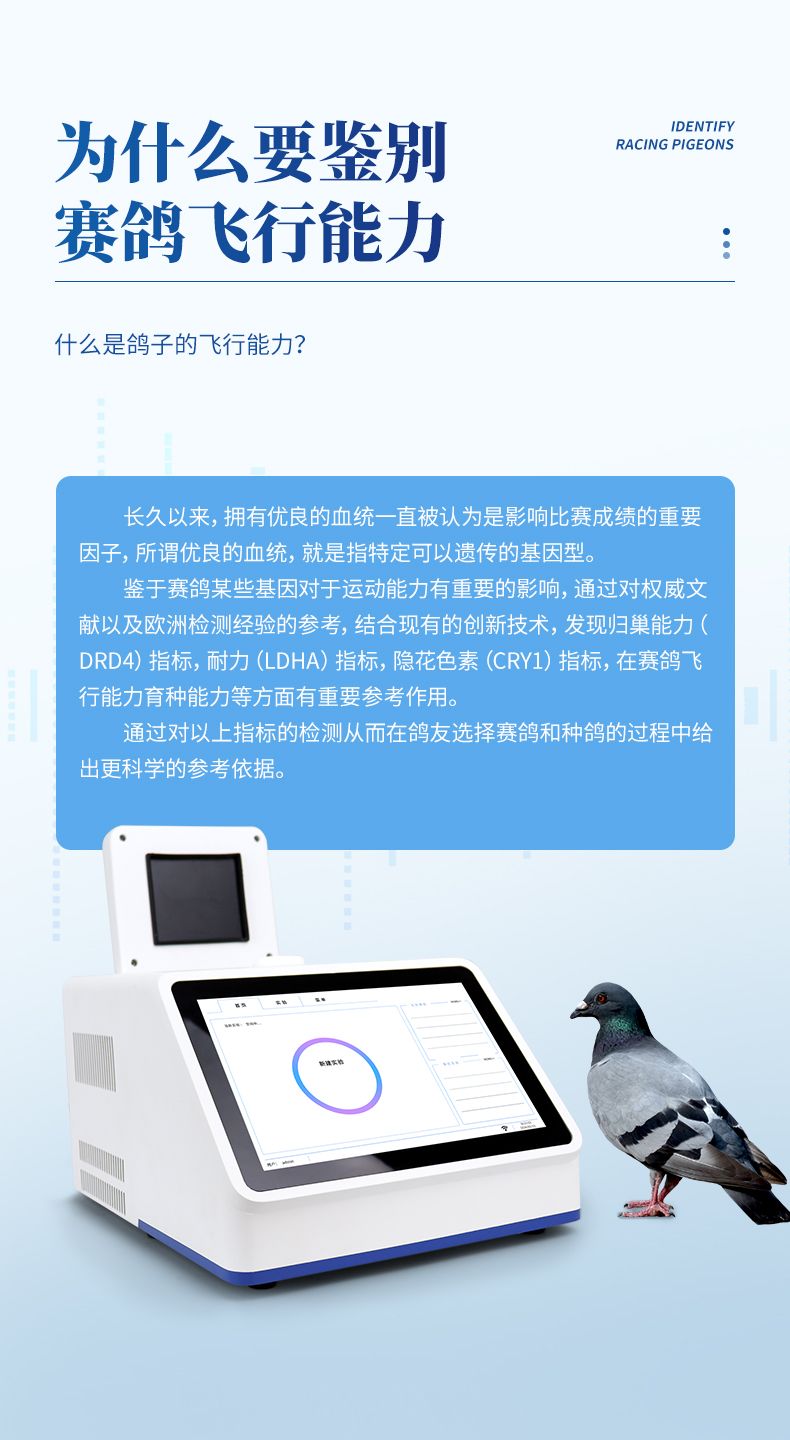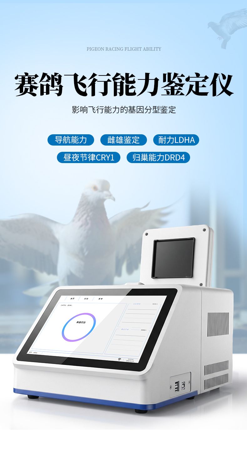 我司結(jié)合上述基因研究推出的鴿子飛行能力鑒定儀可同時(shí)鑒定包含鴿子雌雄性別及歸巢能力DRD4、飛行耐力LDHA、導(dǎo)航能力、晝夜節(jié)律CRY1、肌力(肌肉調(diào)控)MSTN、羽翼(羽毛結(jié)構(gòu)和強(qiáng)度)F-KER、智力CASK和陰雨天定向GSR等影響飛行能力的基因分型鑒定。