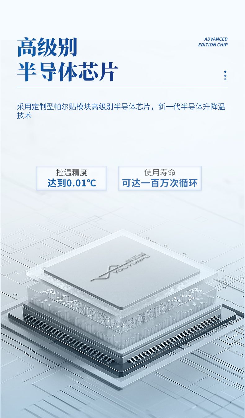 2、采用美國MARLOW定制型帕爾貼模塊高級(jí)別半導(dǎo)體芯片,新一代半導(dǎo)體升降溫技術(shù),最快變溫速率可達(dá)每秒7度,使用壽命可達(dá)一百萬次循環(huán);