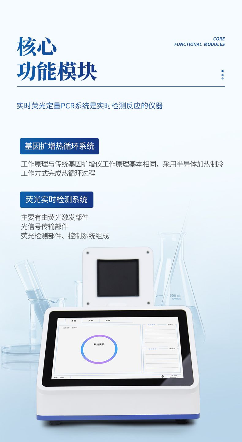 實(shí)時(shí)熒光定量PCR系統(tǒng)是實(shí)時(shí)檢測(cè)反應(yīng)的儀器,主要由基因擴(kuò)增熱循環(huán)系統(tǒng)、熒光實(shí)時(shí)檢測(cè)系統(tǒng)、微電路控制系統(tǒng)、計(jì)算機(jī)及應(yīng)用軟件組成。其中兩個(gè)核心功能模塊:熱循環(huán)系統(tǒng)和熒光實(shí)時(shí)檢測(cè)系統(tǒng)。其中基因擴(kuò)增熱循環(huán)系統(tǒng)工作原理與傳統(tǒng)基因擴(kuò)增儀工作原理基本相同,采用半導(dǎo)體加熱制冷工作方式完成熱循環(huán)過程。熒光檢測(cè)系統(tǒng)主要有由熒光激發(fā)部件、光信號(hào)傳輸部件、熒光檢測(cè)部件、控制系統(tǒng)組成。