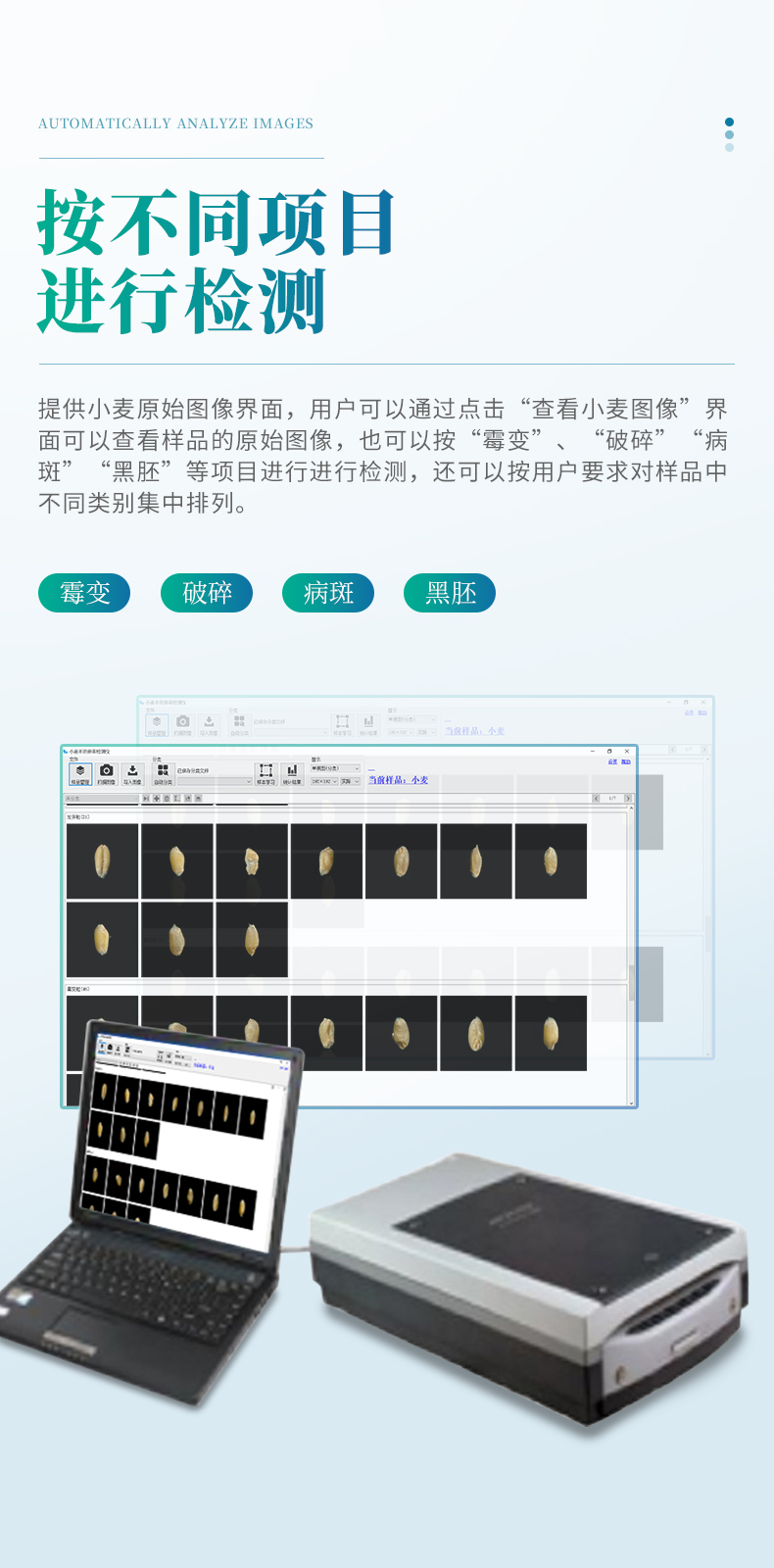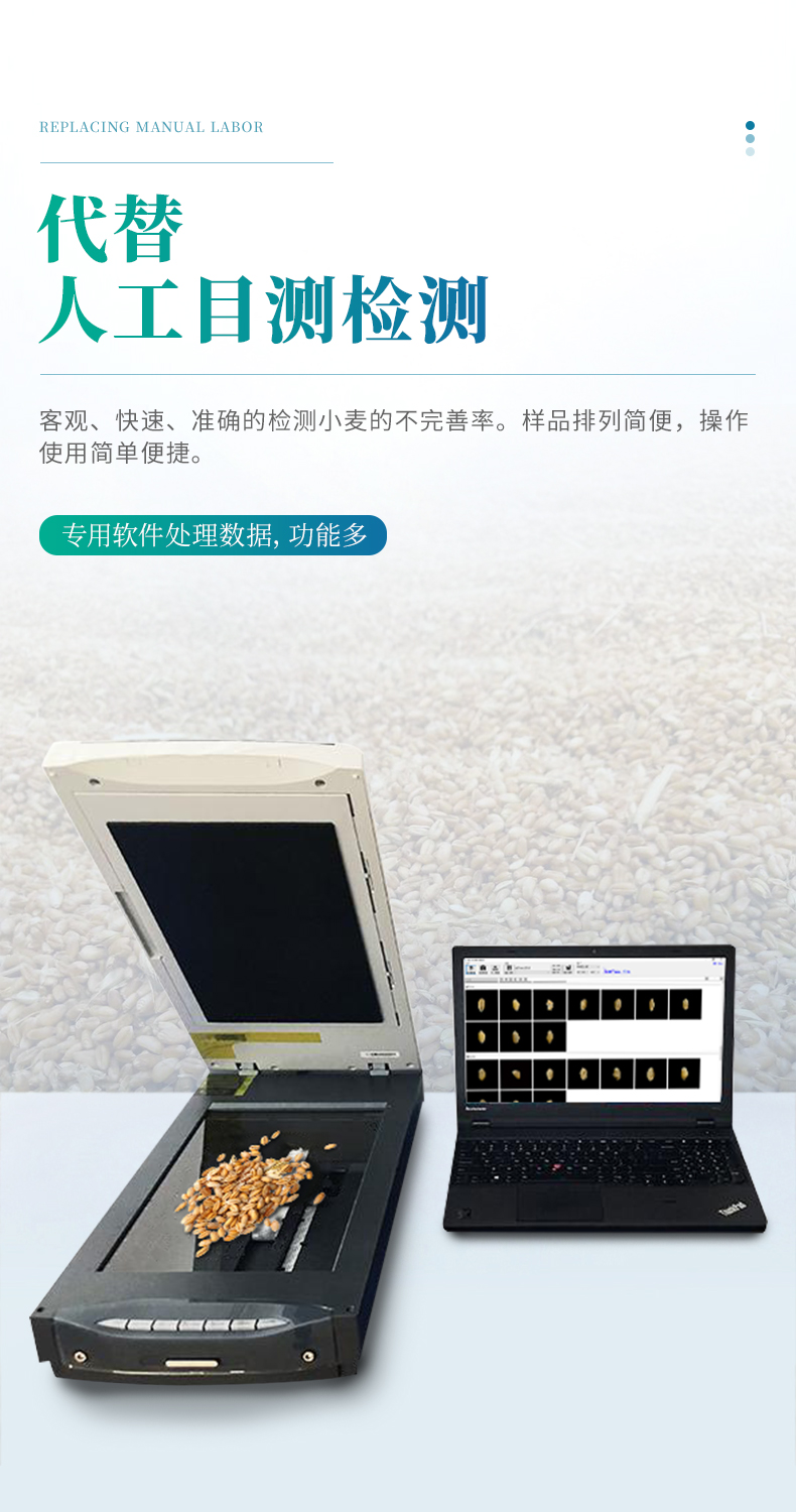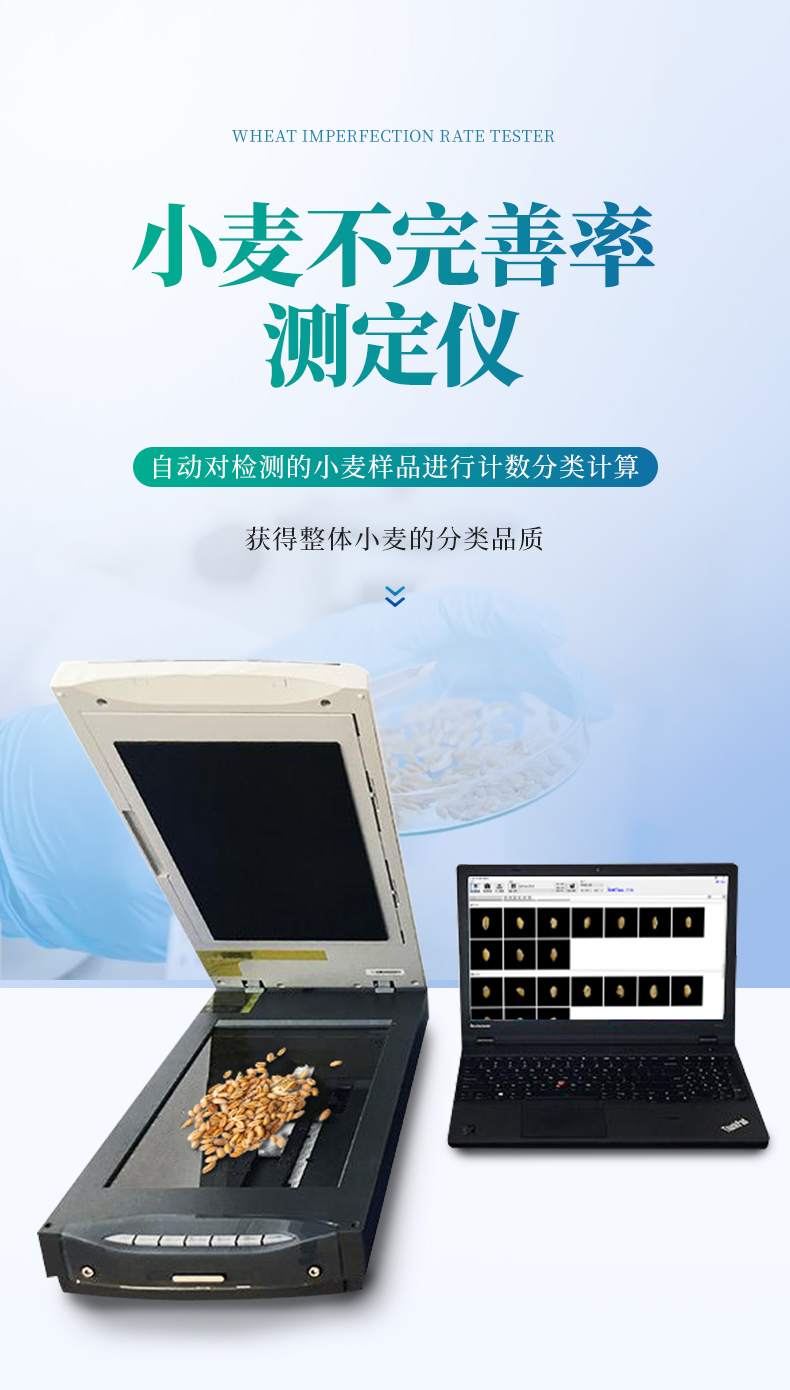 小麥不完善軟件連接專用掃描儀,掃描出小麥正反兩面的電子照片,通過軟件識別自動對檢測的小麥樣品進(jìn)行計數(shù)分類計算。從而獲得整體小麥的分類品質(zhì)。