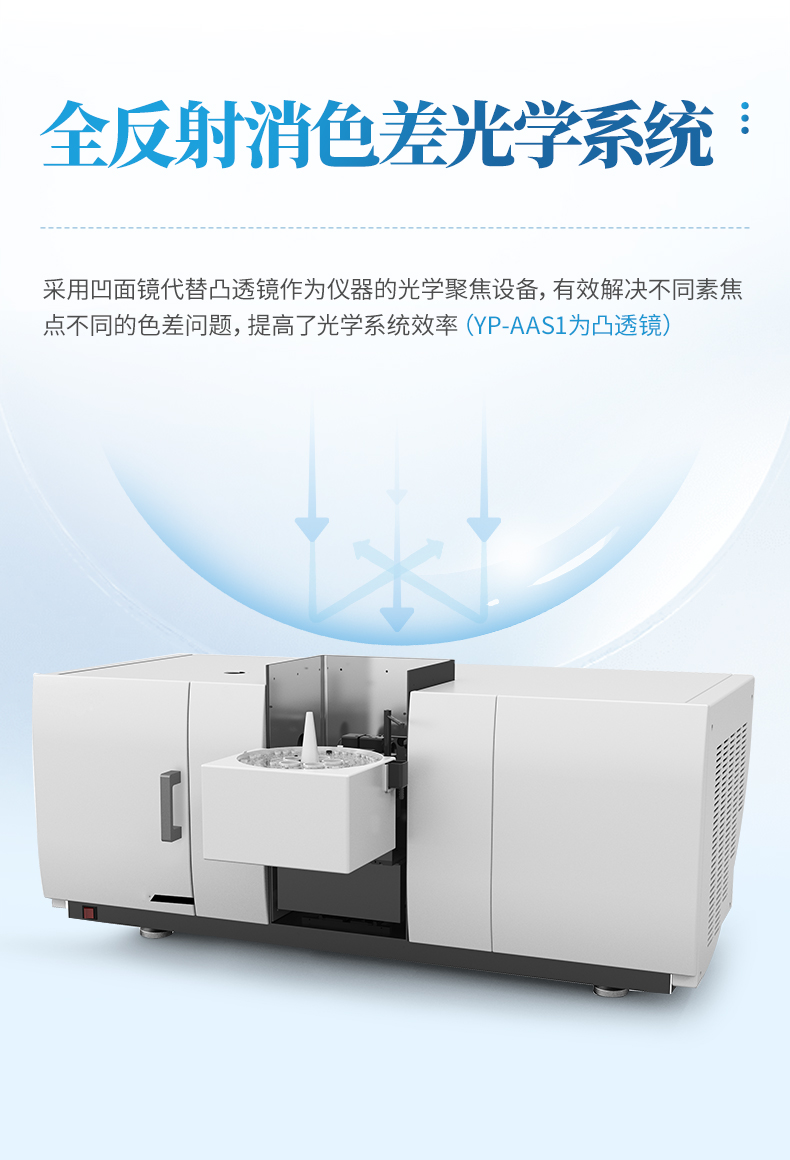 單石墨爐原子吸收分光光度計采用凹面鏡代替凸透鏡,有效解決了不同元素聚焦點(diǎn)不同產(chǎn)生的色差問題,提高了光學(xué)轉(zhuǎn)換效率。
