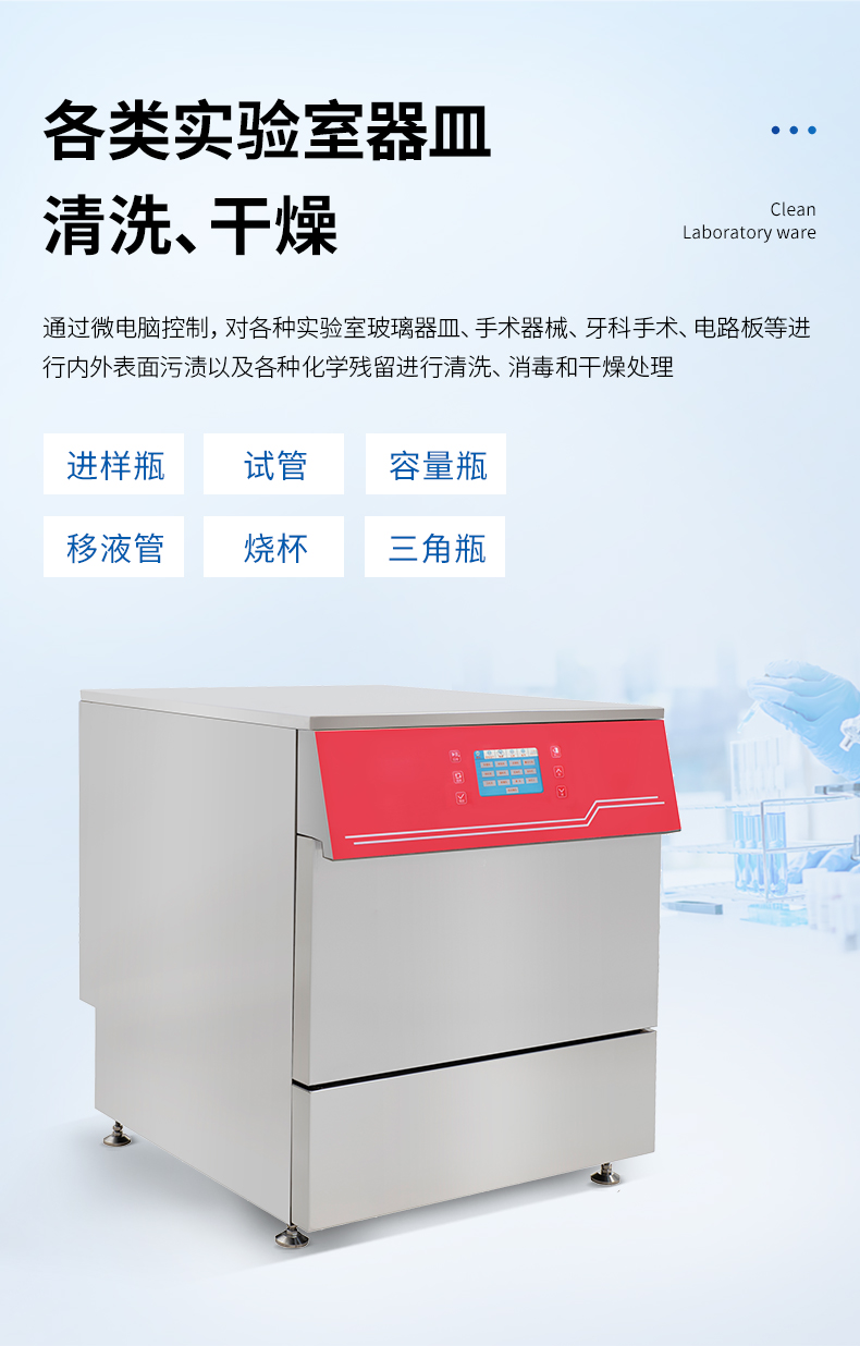 1.1 通過清洗水的噴淋和清洗液的溶解剝離,協(xié)助清洗實驗室玻璃器皿或塑料的無機殘留物(如鉛、汞、鎘、砷等)和有機殘留物(如工業(yè)染料、激素、油脂、灰塵等)