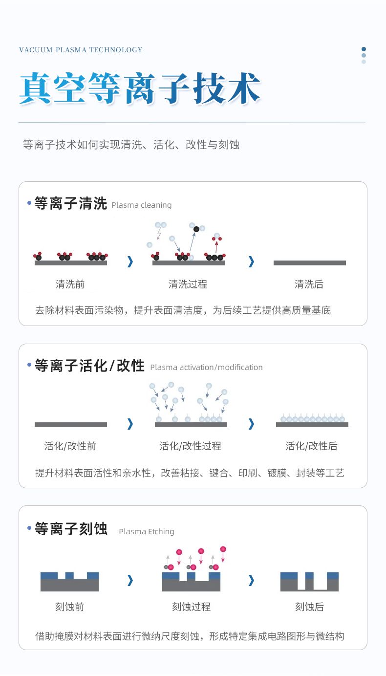在真空腔體里,通過(guò)射頻電源在一定的壓力情況下起輝產(chǎn)生高能量的無(wú)序的等離子體,通過(guò)等離子體轟擊被清洗產(chǎn)品表面,以達(dá)到清洗目的.