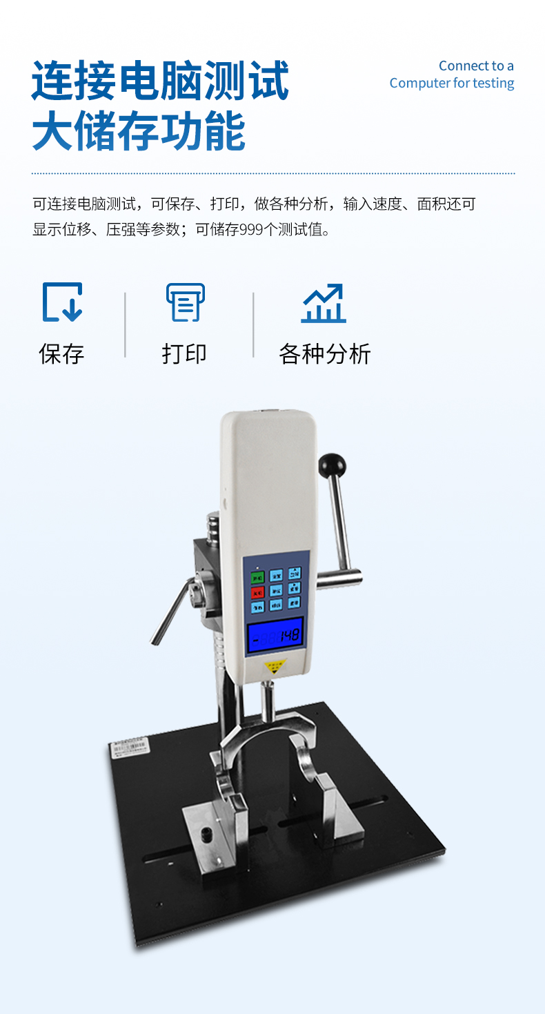 3、可連接電腦測試,可保存、打印,做各種分析,輸入速度、面積還可顯示位移、壓強等參數(shù);