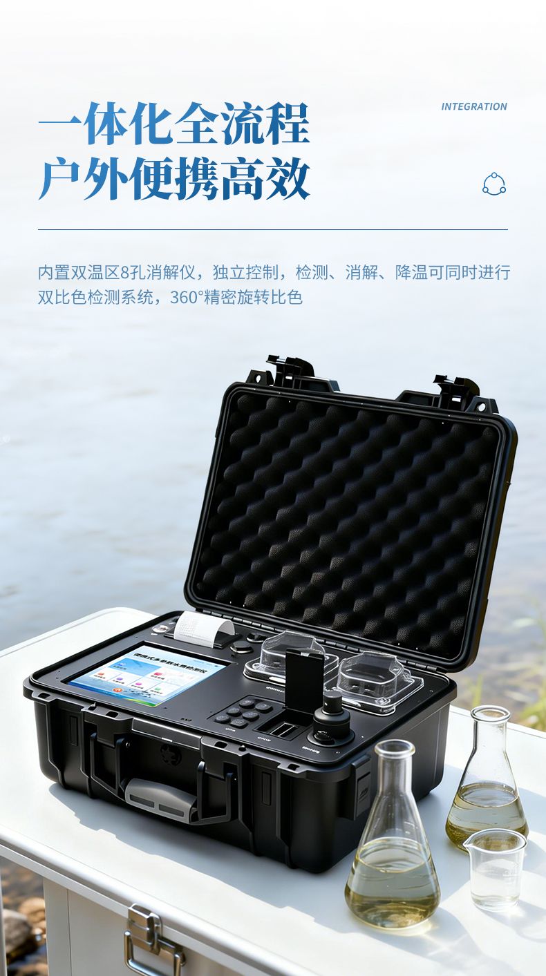 4.便攜一體式檢測設(shè)備,內(nèi)置大容量鋰電池,可一機(jī)實(shí)現(xiàn)戶外水樣消解、測定;