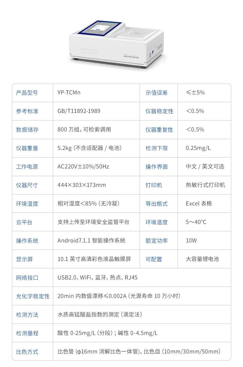 便攜式高錳酸鹽指數(shù)測定儀采用高強(qiáng)度PVC工程塑料手提箱設(shè)計(jì),消解檢測一體式設(shè)計(jì),其中消解模塊具備雙溫區(qū)功能,檢測部分同時(shí)具備360°旋轉(zhuǎn)比色試管檢測和比色皿檢測,安卓智能操作系統(tǒng),8英寸高清液晶觸摸屏,光纖檢測技術(shù),進(jìn)口光源,內(nèi)置大容量鋰電池,便攜多參數(shù)水質(zhì)檢測儀具有性能穩(wěn)定、測量準(zhǔn)確、測定范圍廣、功能強(qiáng)大、操作簡單等特點(diǎn)。