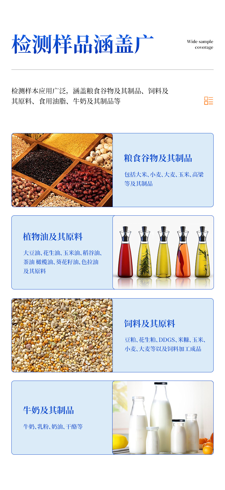 3、內(nèi)置定量標(biāo)準(zhǔn)曲線:儀器內(nèi)置標(biāo)準(zhǔn)曲線,無(wú)需使用標(biāo)準(zhǔn)品,檢測(cè)時(shí)無(wú)需做標(biāo)準(zhǔn)曲線,既節(jié)省了成本,也避免了操作人員與嘔吐毒素的接觸,保護(hù)操作人員的安全;