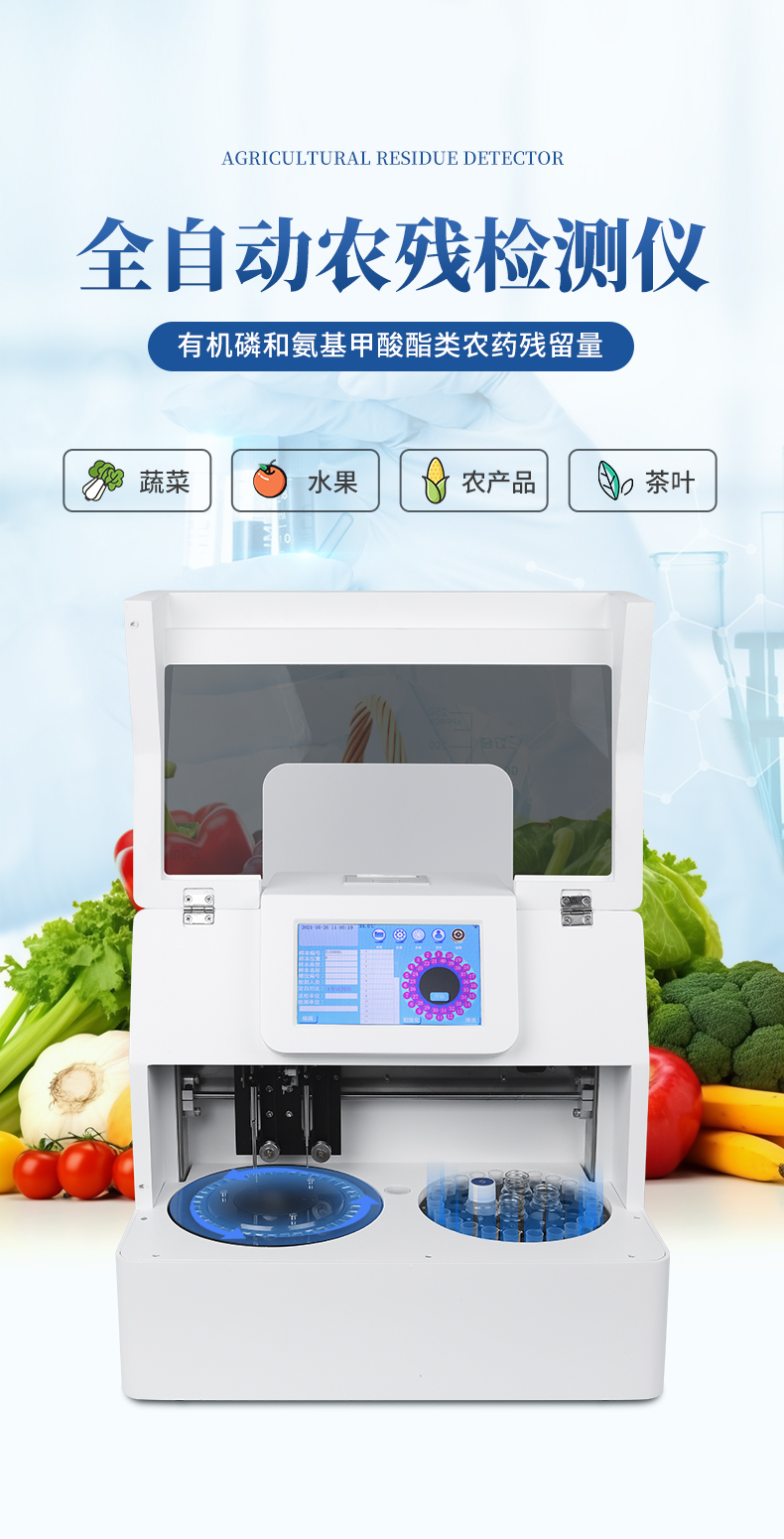 全自動農(nóng)殘檢測儀主要用于定量分析蔬菜、水果等樣本的農(nóng)藥殘留成分。檢測系統(tǒng)主要包括項目參數(shù)、試劑位置、儀器調(diào)校、設(shè)置、樣本信息、結(jié)果查詢、初始化、全盤清洗等功能模塊。具有分析速度適中、無交叉污染、消耗品少、試劑開放等特點。