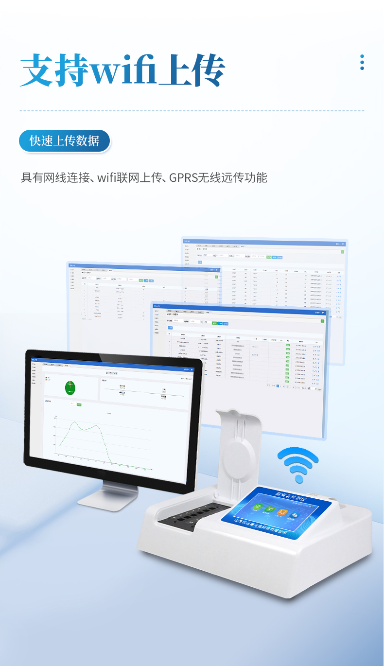 2、儀器具有網(wǎng)線連接、wifi聯(lián)網(wǎng)上傳、GPRS無線遠(yuǎn)傳功能,快速上傳數(shù)據(jù)。