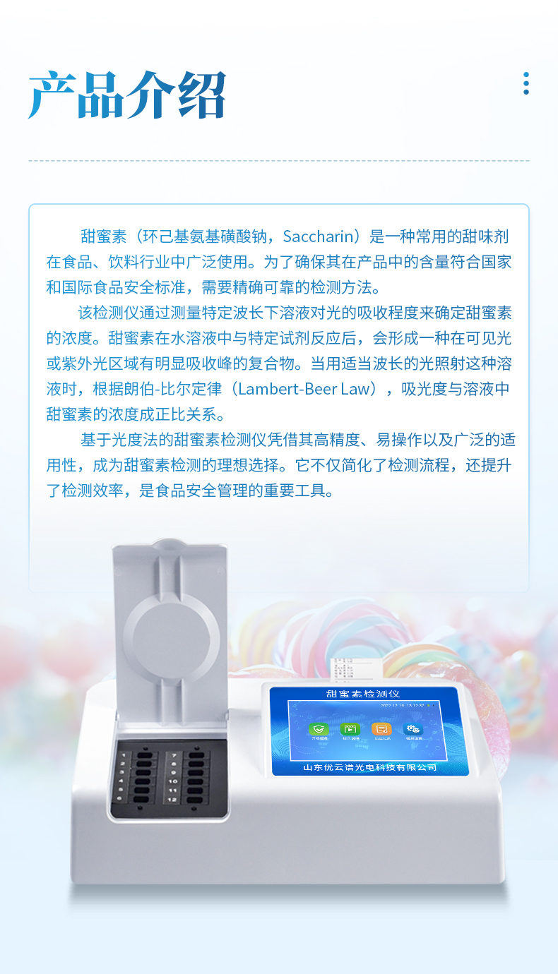 該檢測儀通過測量特定波長下溶液對光的吸收程度來確定甜蜜素的濃度。甜蜜素在水溶液中與特定試劑反應(yīng)后,會形成一種在可見光或紫外光區(qū)域有明顯吸收峰的復(fù)合物。當(dāng)用適當(dāng)波長的光照射這種溶液時,根據(jù)朗伯-比爾定律(Lambert-Beer Law),吸光度與溶液中甜蜜素的濃度成正比關(guān)系。