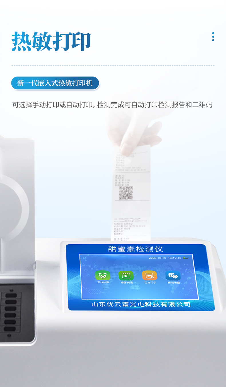 4、配備新一代嵌入式熱敏打印機(jī),可選擇手動打印或者自動打印,檢測完成可自動打印檢測報(bào)告和二維碼。