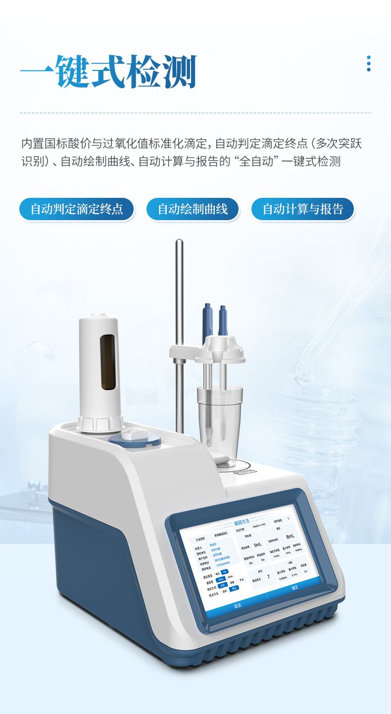 3.內(nèi)置國標(biāo)酸價(jià)與過氧化值標(biāo)準(zhǔn)化滴定,自動判定滴定終點(diǎn)(多次突躍識別)、自動繪制曲線、自動計(jì)算與報(bào)告的“全自動”一鍵式檢測;