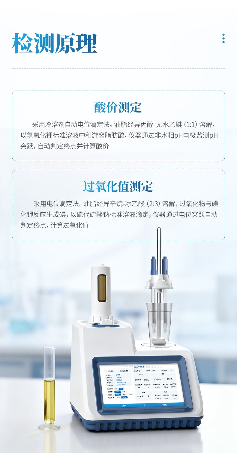 過氧化值測定:采用電位滴定法。油脂經(jīng)異辛烷-冰乙酸(2:3)溶解,過氧化物與碘化鉀反應(yīng)生成碘,以硫代硫酸鈉標(biāo)準(zhǔn)溶液滴定,儀器通過電位突躍自動判定終點(diǎn),計(jì)算過氧化值。