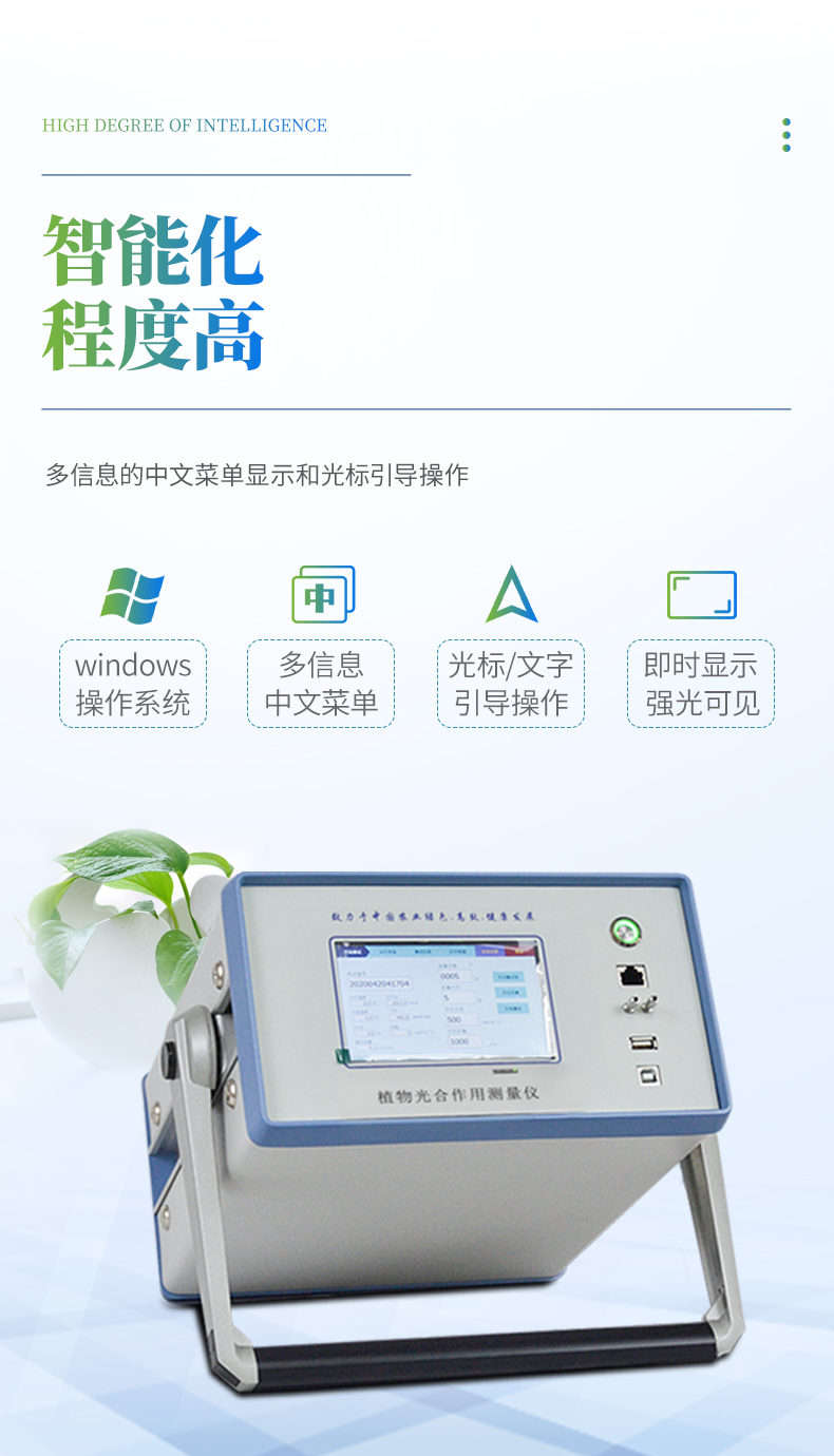 智能化:采用windows 操作系統(tǒng),觸摸顯示屏。多信息的中文菜單顯示和文字引導(dǎo)操作,即時將測定過程及最終結(jié)果屏幕顯示、存儲。并可顯示Pn曲線、Tr曲線、光-光合曲線以及濕度-蒸騰曲線;