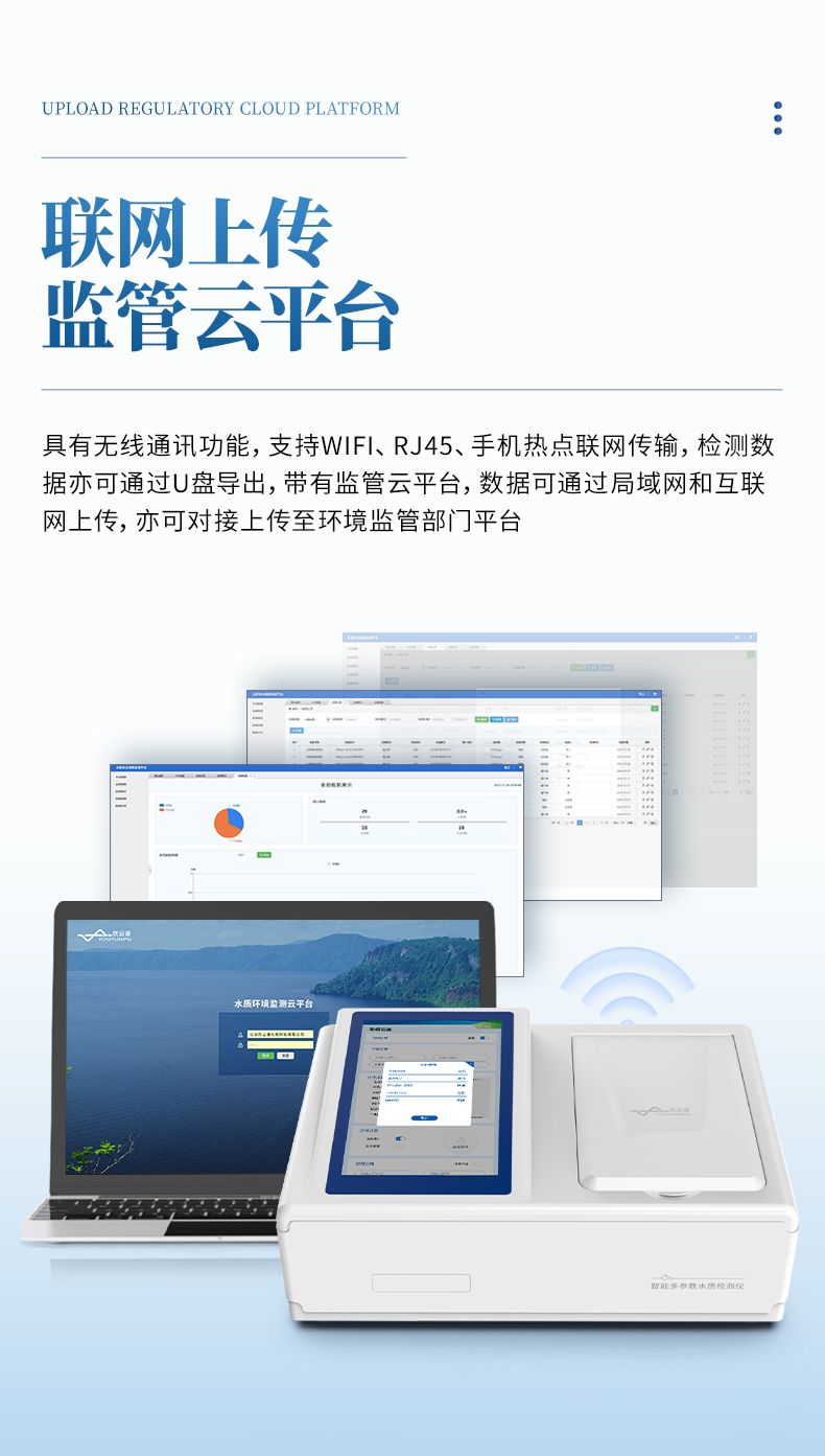 10、儀器帶有監(jiān)管云平臺(tái),數(shù)據(jù)可通過局域網(wǎng)和互聯(lián)網(wǎng)上傳,亦可對(duì)接上傳至環(huán)境監(jiān)管部門平臺(tái)。