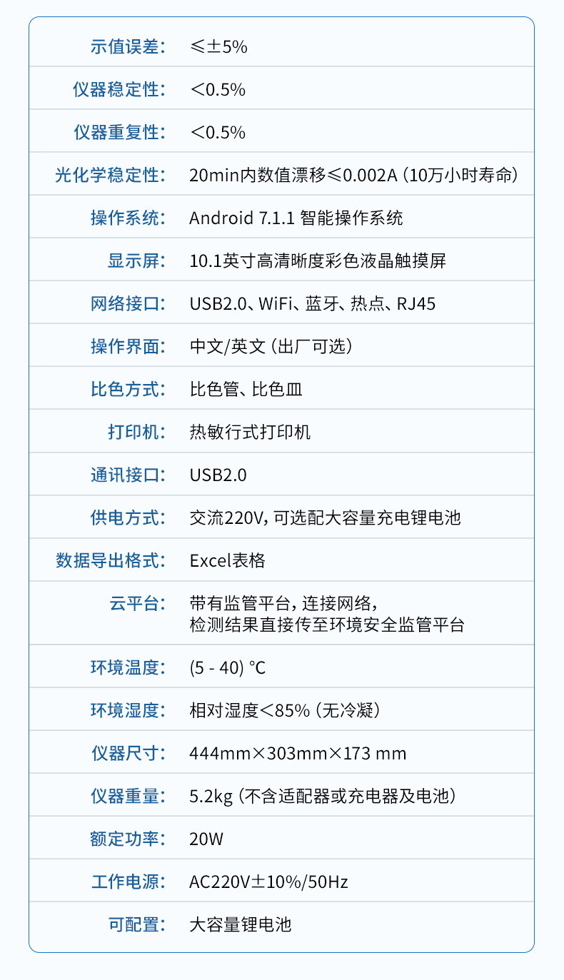 光化學(xué)穩(wěn)定性:20min內(nèi)數(shù)值漂移≤0.002A(10萬小時(shí)壽命);