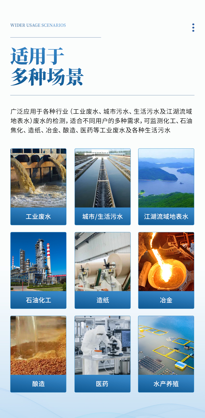 能夠廣泛的應(yīng)用于各種行業(yè)(工業(yè)廢水、城市污水、生活污水及江湖流域地表水)廢水的檢測(cè),可適合不同用戶的多種需求,可在化工、石油、焦化、造紙、冶金、釀造、醫(yī)藥等工業(yè)廢水及各種生活污水監(jiān)測(cè)應(yīng)用。