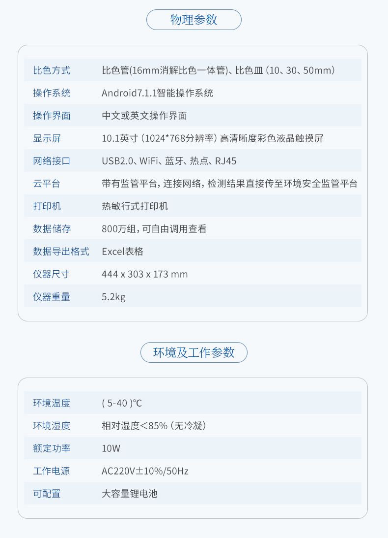 云平臺:儀器帶有監(jiān)管平臺,連接有線/無線網絡,檢測結果直接傳輸至環(huán)境安全監(jiān)管平臺。