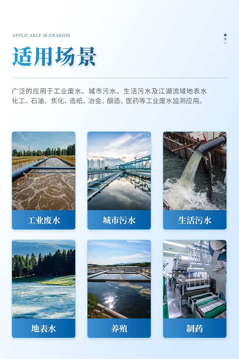 廣泛應(yīng)用于應(yīng)急監(jiān)測、工業(yè)廢水、生活污水、污水處理、醫(yī)藥化工、食品、飲品、紡織印染、電鍍、造紙、石油冶金、河流治理、科研單位、院校等領(lǐng)域。