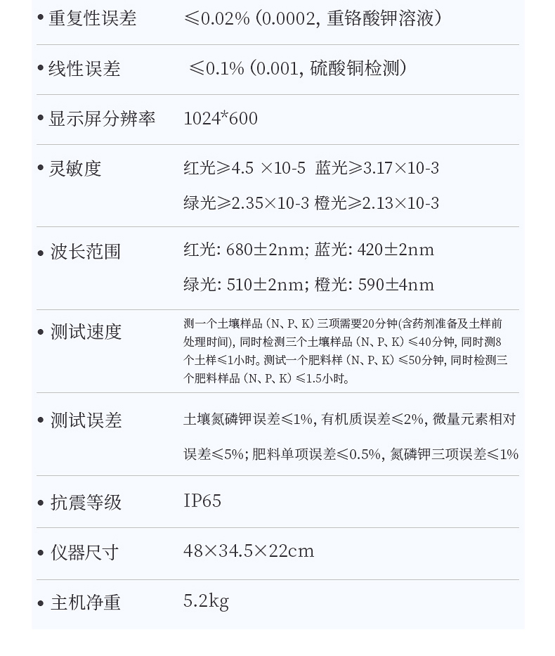 土壤氮磷鉀誤差≤1%,有機(jī)質(zhì)誤差≤2%,微量元素相對(duì)誤差≤5%;肥料單項(xiàng)誤差≤0.5%,氮磷鉀三項(xiàng)誤差≤1%。