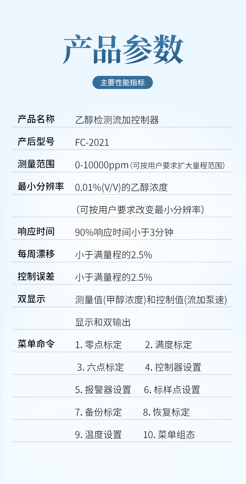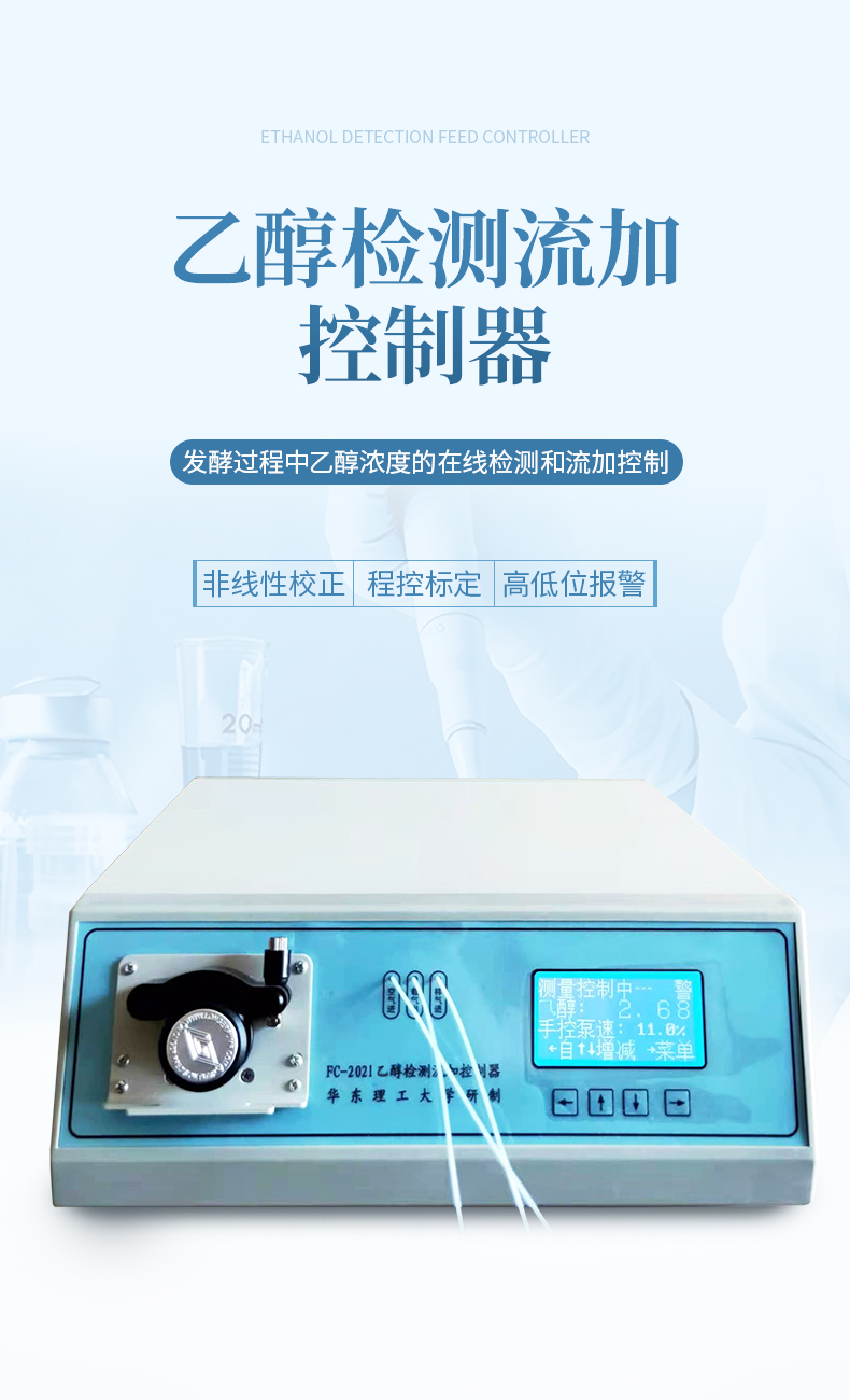 FC2021型乙醇檢測流加控制器是由單片微型計算機控制的智能化儀表。主要用于發(fā)酵過程中乙醇濃度的在線檢測和流加控制。