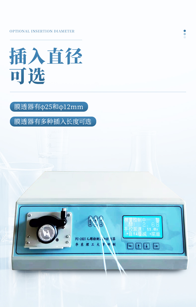 在線測量發(fā)酵液中乙醇濃度,膜透器選用了不銹鋼絲網(wǎng)增強的高分子乙醇透過膜,可直接蒸汽滅菌。檢測傳感器工作在恒溫器中,克服了傳感器響應(yīng)的環(huán)境溫度影響。膜透器有φ25和φ12mm