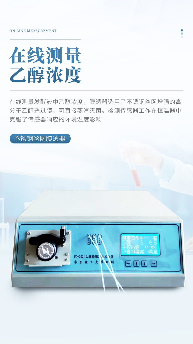 壓縮空氣(載氣)經(jīng)由膜透器流過時,發(fā)酵液中的乙醇透過不銹鋼絲網(wǎng)增強的高分子膜,匯入到載氣流中,并被載氣帶至檢測傳感器轉(zhuǎn)換為電信號,檢測電信號經(jīng)電子線路放大,由機內(nèi)微型計算機計算測量結(jié)果,并進行PID運算,測量值和控制值送至顯示窗顯示,并在兩個模擬信號輸出口輸出4-20mA模擬信號,用于外接記錄儀記錄過程乙醇變化曲線和對料液流加蠕動泵轉(zhuǎn)速進行控制,達到發(fā)酵過程乙醇濃度在線檢測和控制目的。